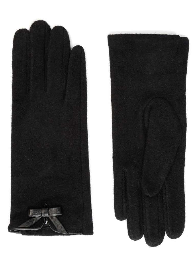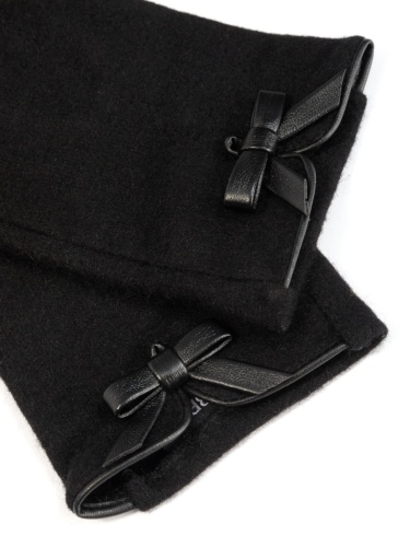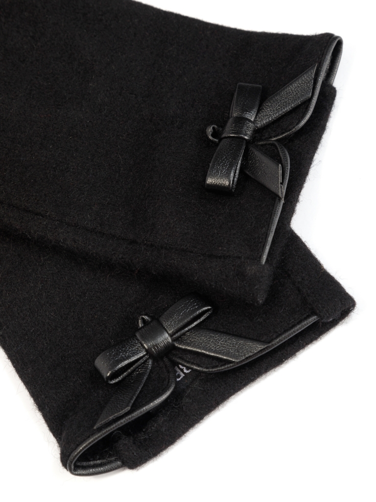 Перчатки выполнены из трикотажной шерсти. Состав трикотажа: 80% шерсть, 20% нейлон. Без подкладки. Отделка - декоративный бантик. Длина манжеты от нижней точки большого пальца до края перчатки - 6 см. Длина пальцев - средняя.
