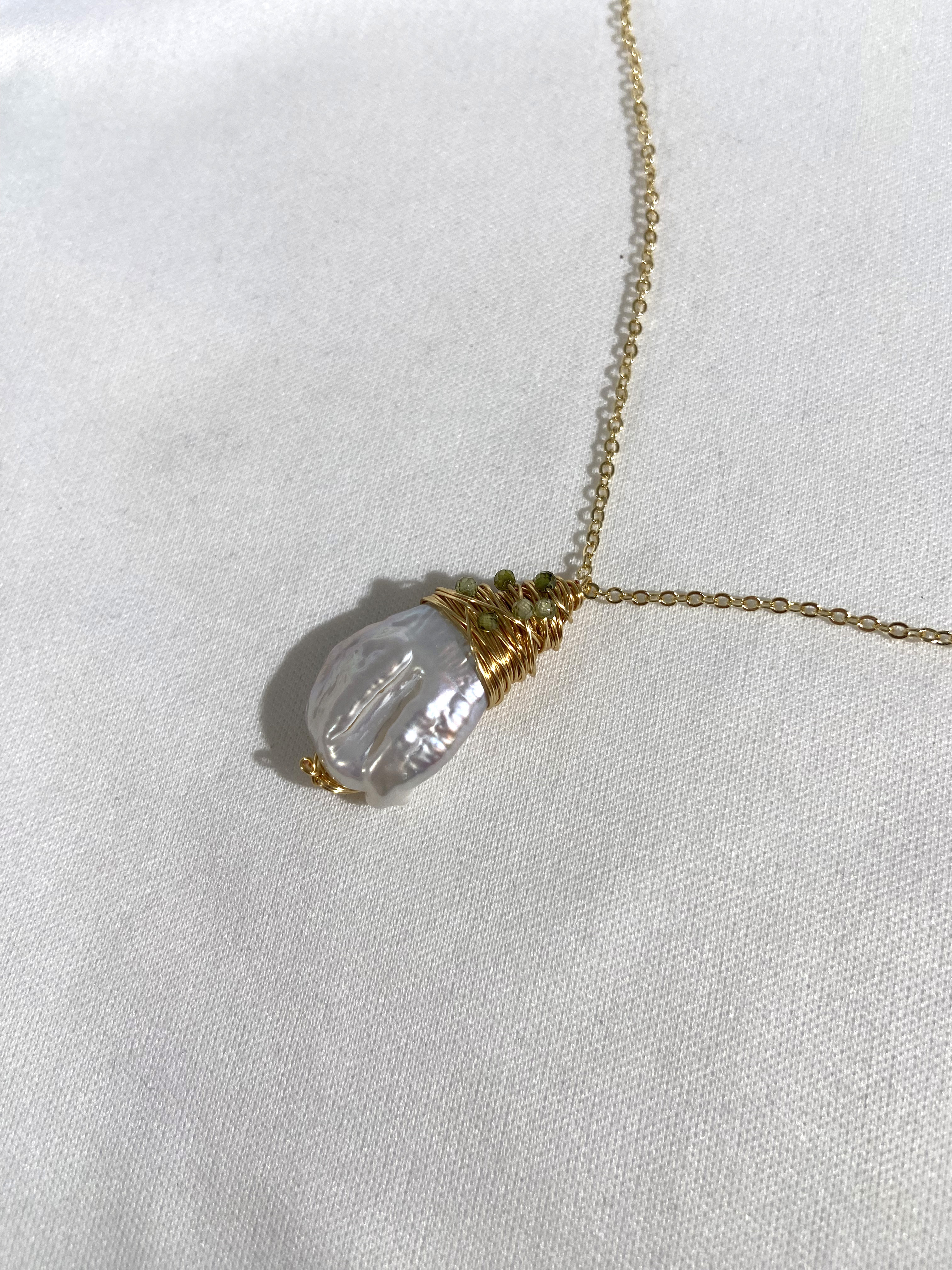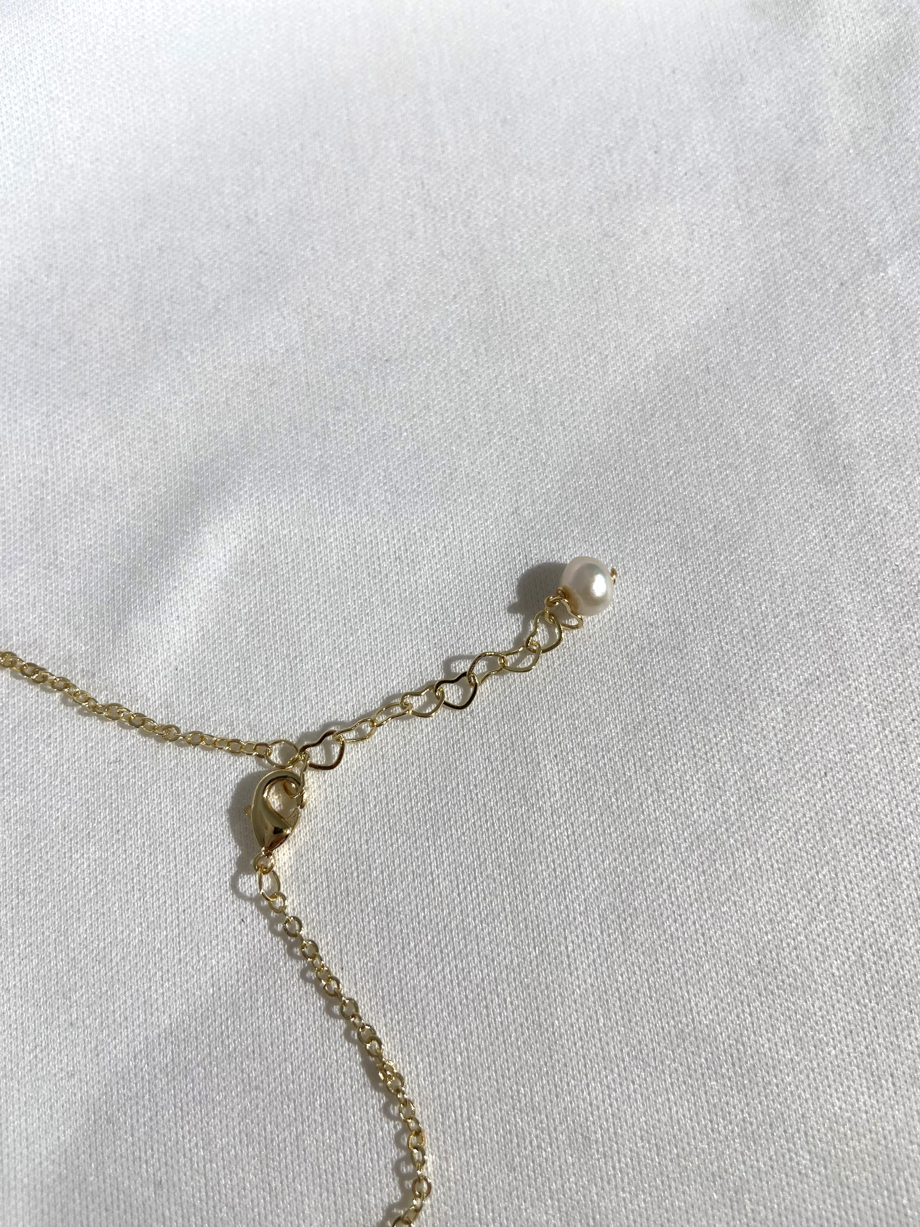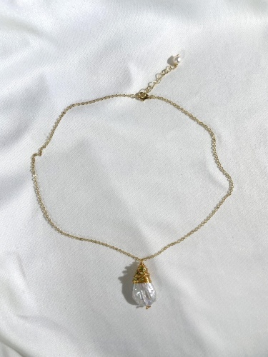 Элегантное колье с золотистой цепочкой и жемчужной подвеской, которое можно регулировать по длине для идеального сочетания с любым нарядом.