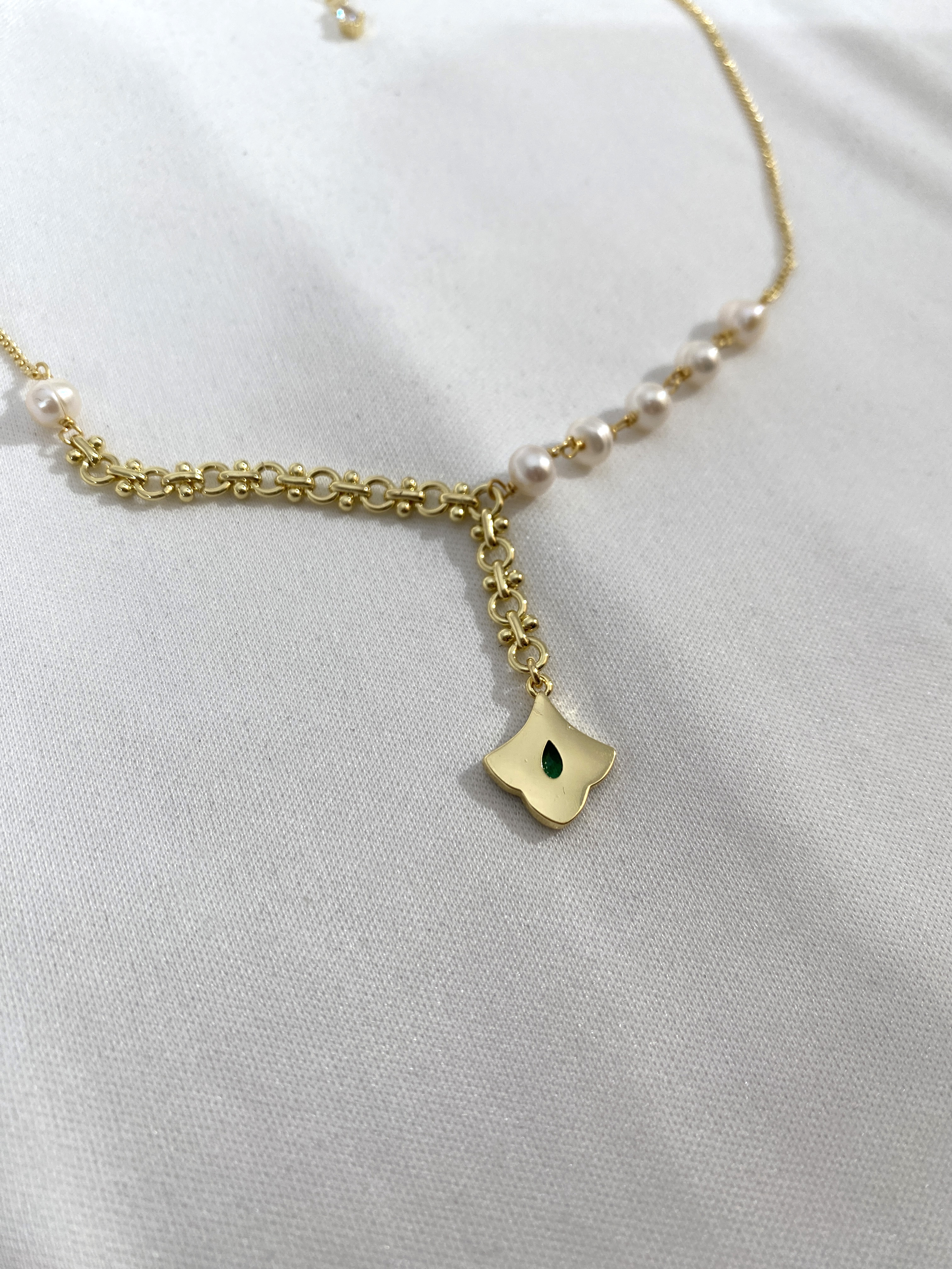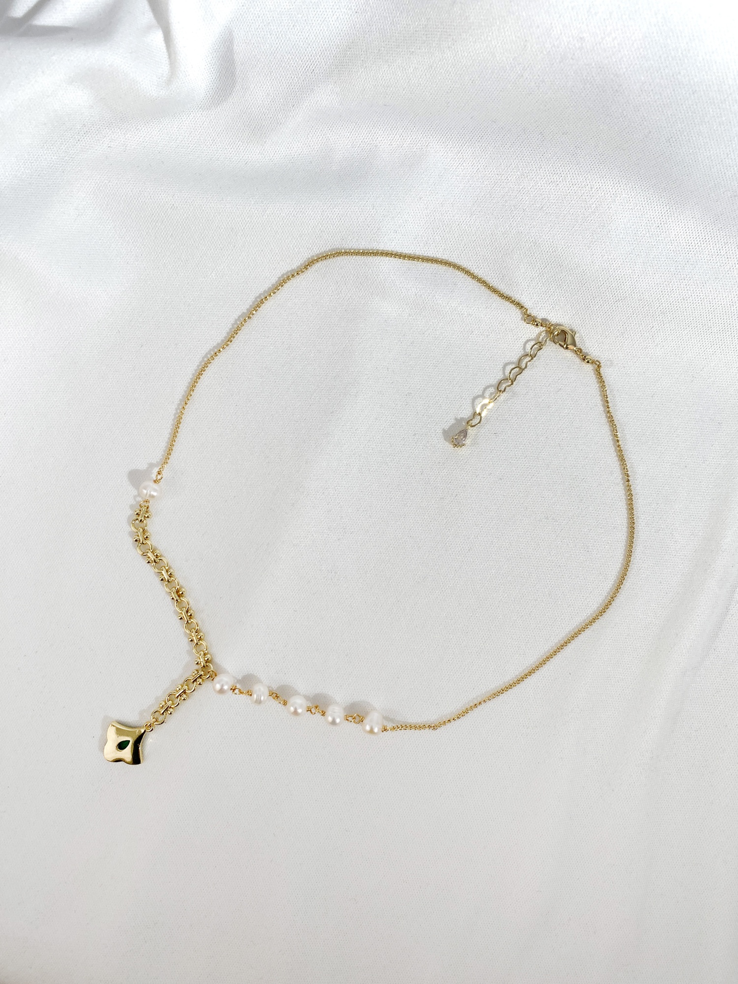 Ассиметричное колье с подвеской в виде цветка и искусственным жемчугом