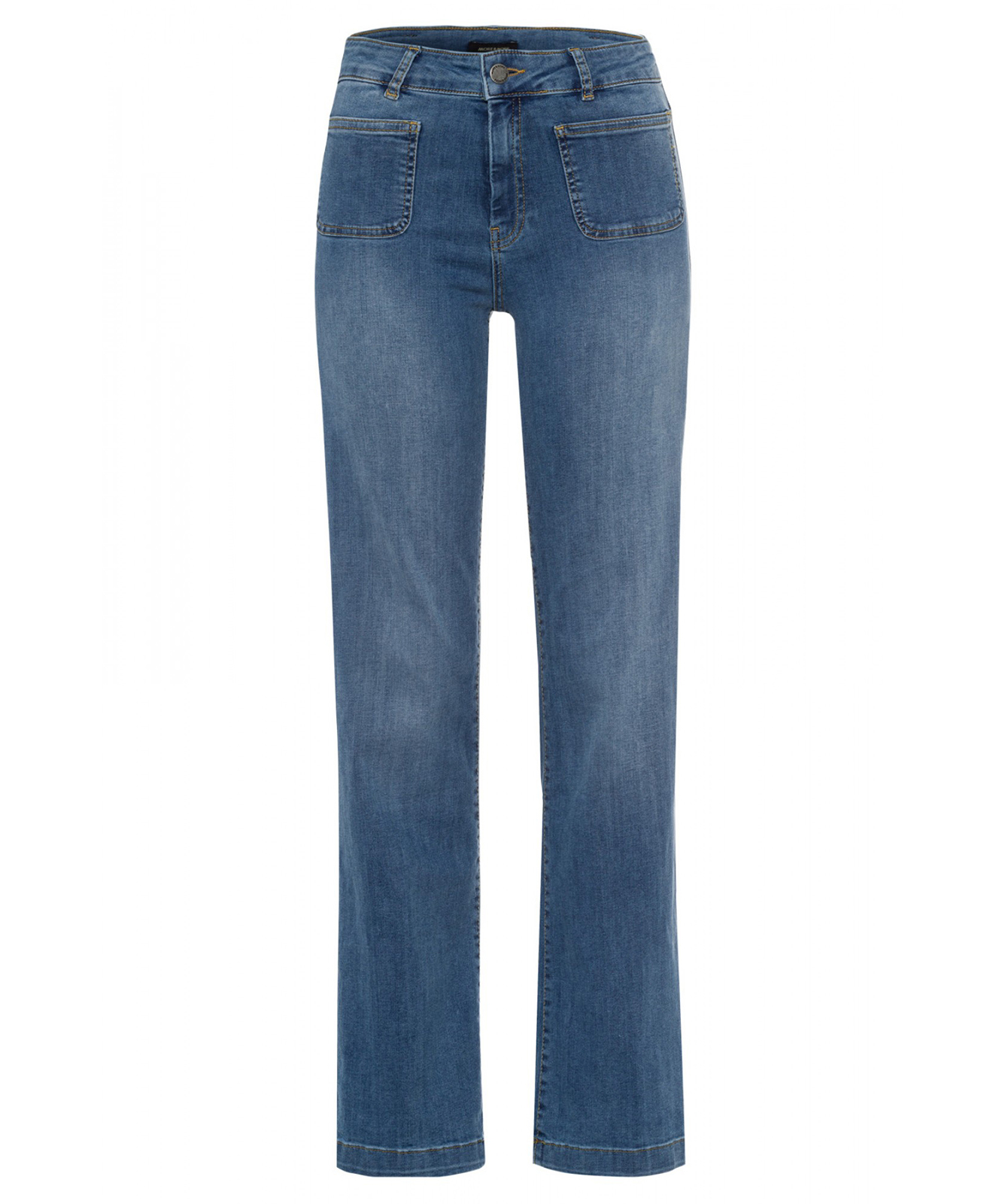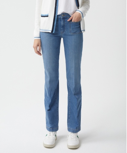 Джинсы прямого кроя. Средняя посадка. Интересным акцентом данной модели являются накладные карманы спереди.