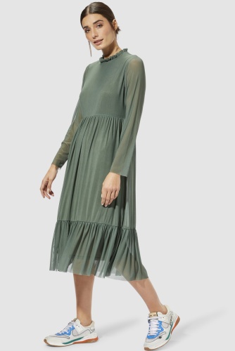 Однотонное платье миди в ретро стиле непринужденно подчеркнет женственность. Воротник-стойка украшен рюшами. Втачной рукав полной длины из полупрозрачного тюля. Волан по краю подола. Сзади вырез-капелька на пуговице.