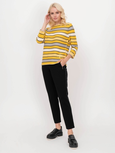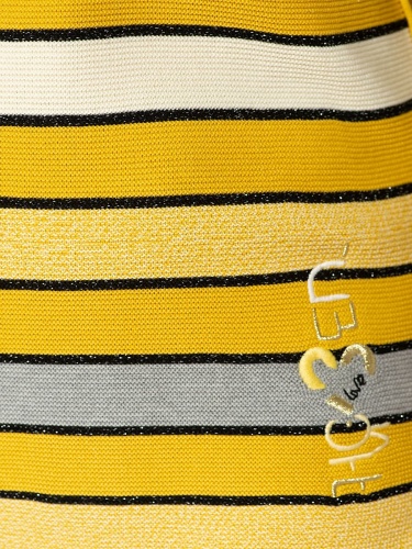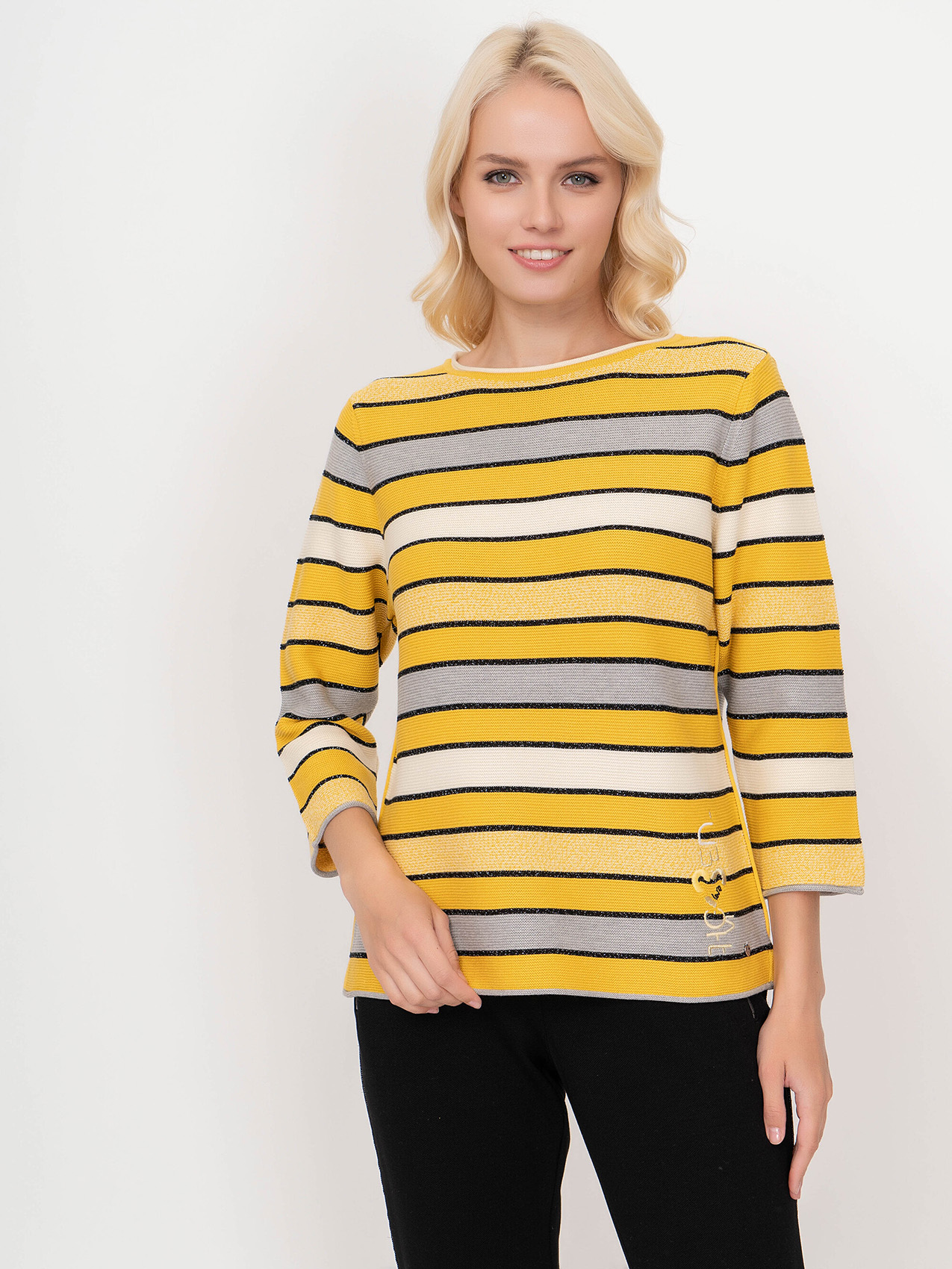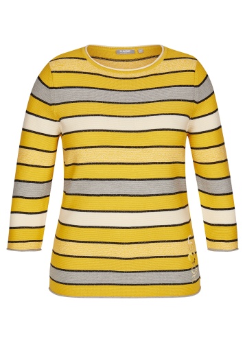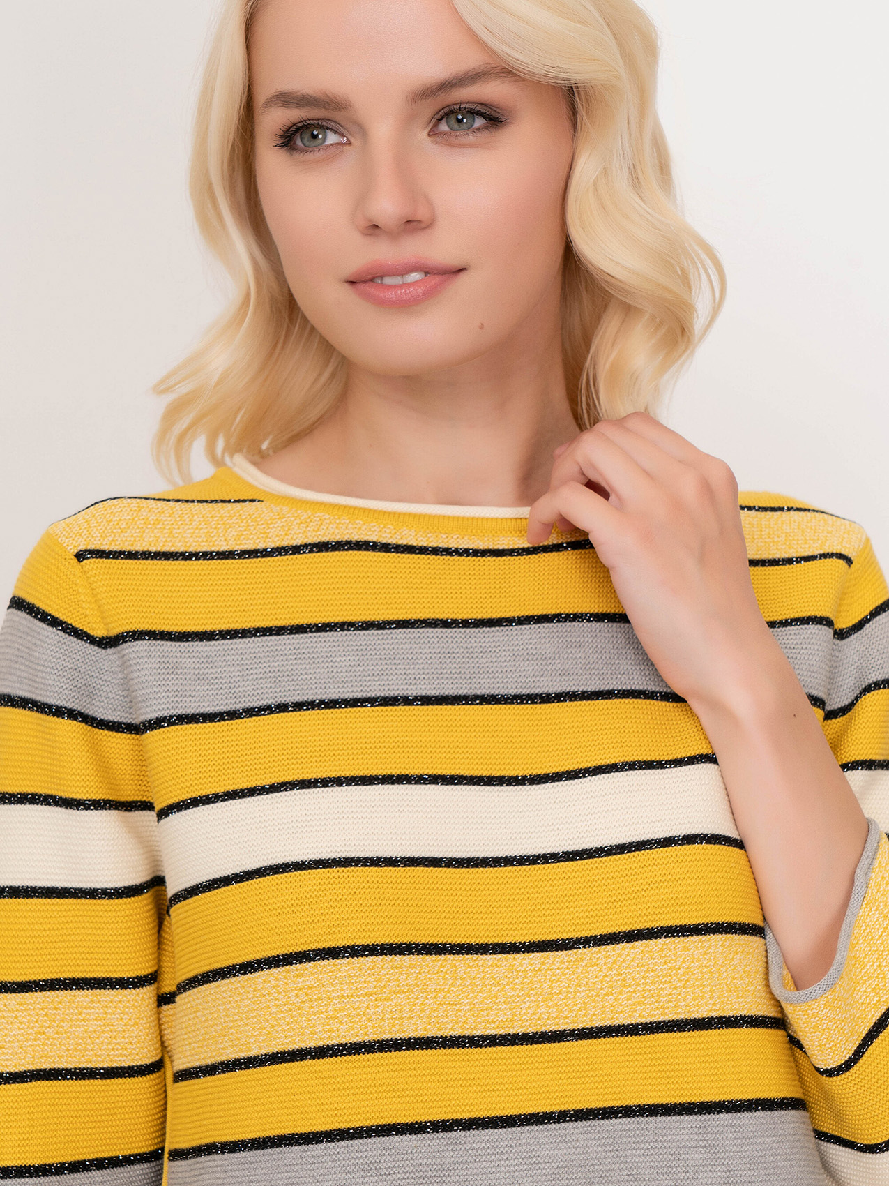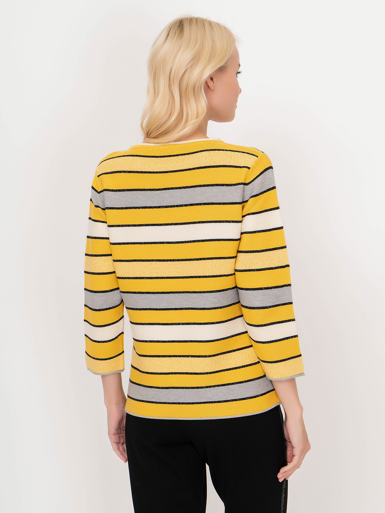 Яркий джемпер обеспечивает отличное настроение в холодное время года. Слегка приталенный силуэт, круглый вырез горловины, втачные рукава 3/4. Полосатый дизайн уверенно держится в тренде, а вплетение нити люрекса придает образу нотку шика. Материал из хлопковой смеси приятен к телу и удобен в ношении.