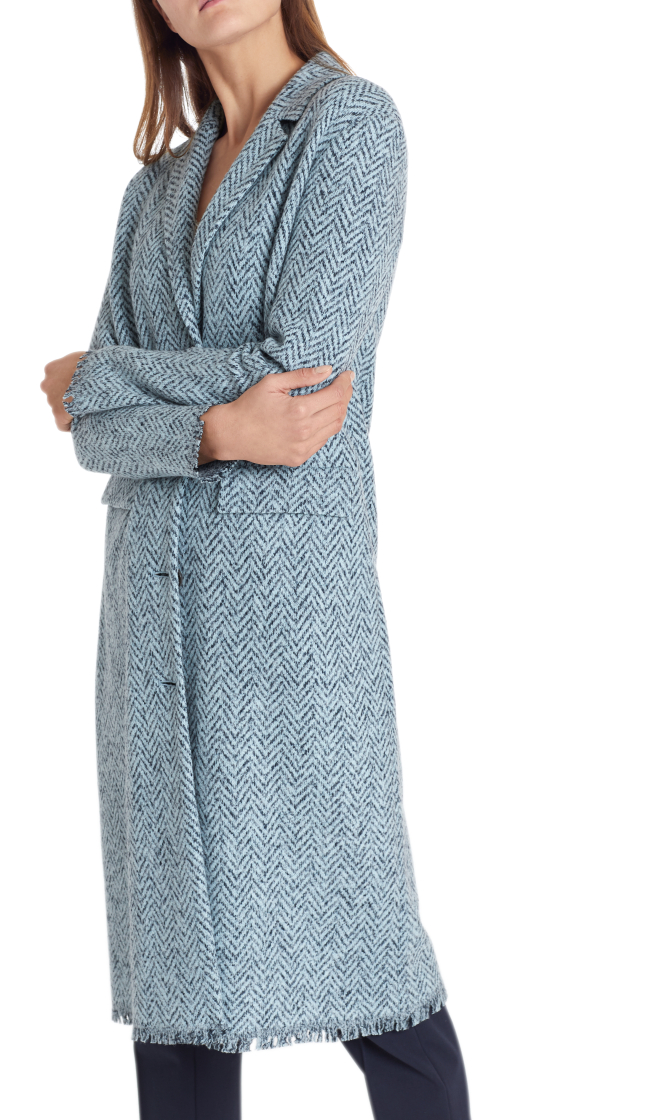 Летнее пальто. Английский воротник, втачной рукав полной длины. Застежка на пуговицы. Отделка бахромой по низу изделия и рукавов.
