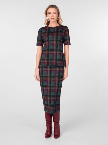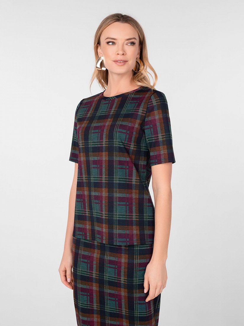 Блуза из трикотажного полотна в клетку прямого силуэта с круглой горловиной и коротким втачным рукавом. Без застежки.
