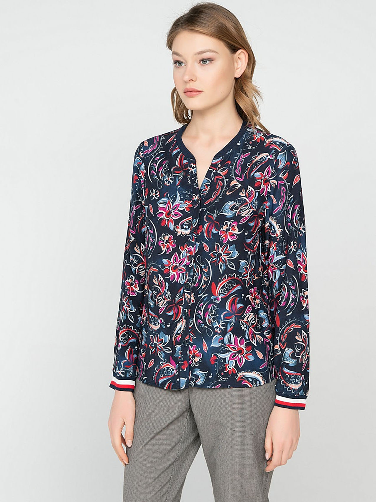 Блузка с контрастным цветочным принтом - стильный акцент в вашем образе! Вискозный материал приятен к телу, а прямой покрой обеспечивает максимальный комфорт. Завершенность дизайну придают круглый вырез, пуговичная планка и трикотажные манжеты на рукавах. Современная женственная модель отлично смотрится как с брюками, так и с юбкой.