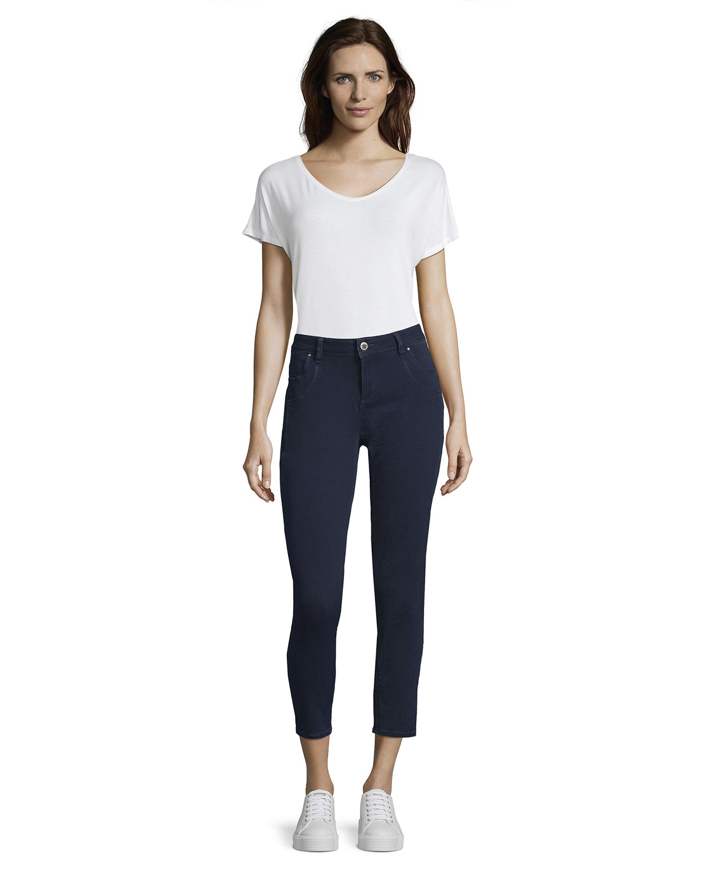Брюки 7/8 позволяют продемонстрировать стильную обувь. Силуэт slim подчеркивает стройные ноги. Материал из смеси хлопка, вискозы и эластана практичен и приятен к телу. Эти брюки - отличный летний вариант для образа в стиле кэжуал!