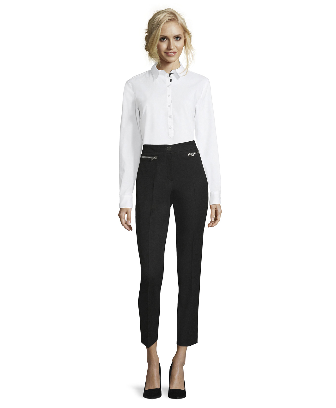 Брюки со стрелками - современная классика! Прямой покрой, средняя посадка. Материал из смеси полиэстера, вискозы и эластана приятен к телу. Эти брюки позволяют создать множество стильных образов с различными вариантами верха и обуви.