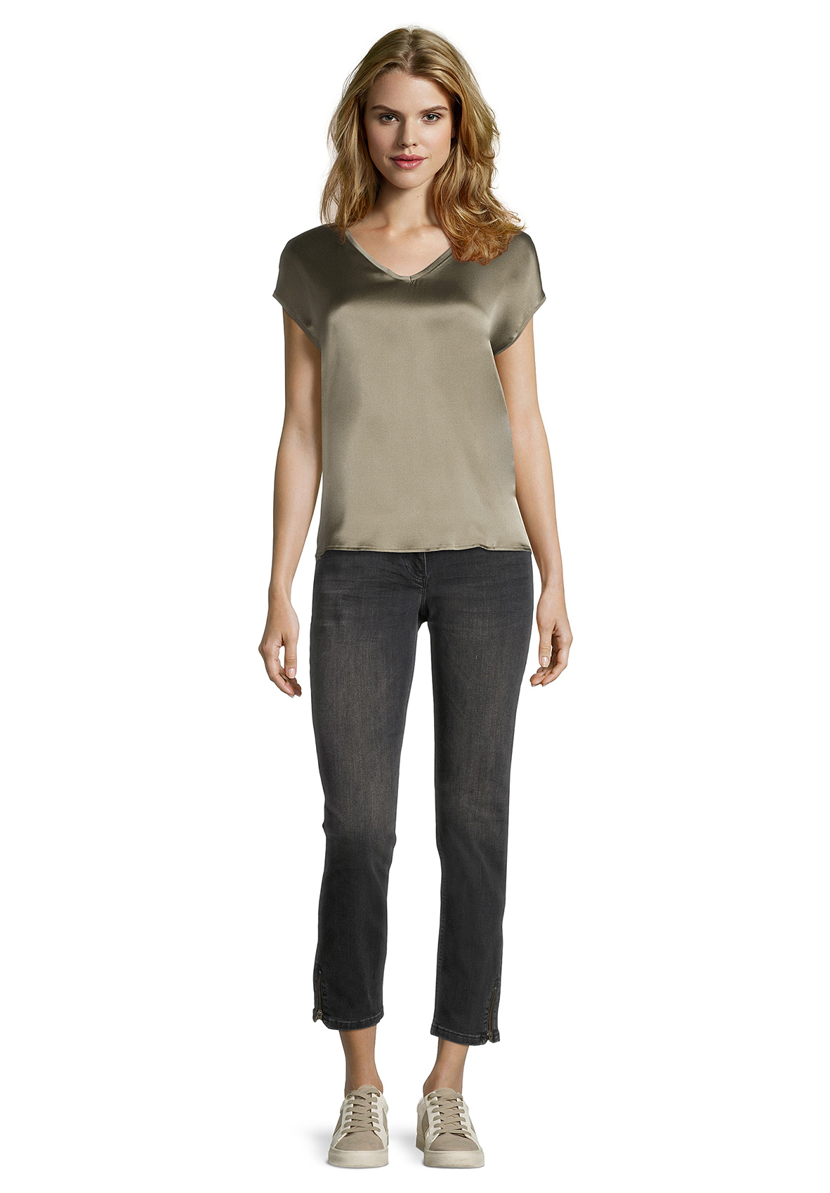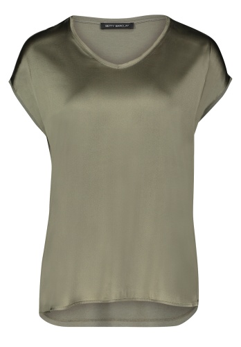 Базовая футболка свободного покроя будет уместна в любом гардеробе! V-образный вырез горловины, короткие цельнокроеные рукава. Приятный к телу материал из шелковой смеси. Шелковый блеск переда придает шик и элегантность всему образу.