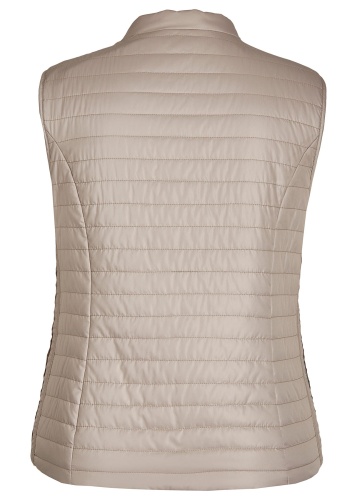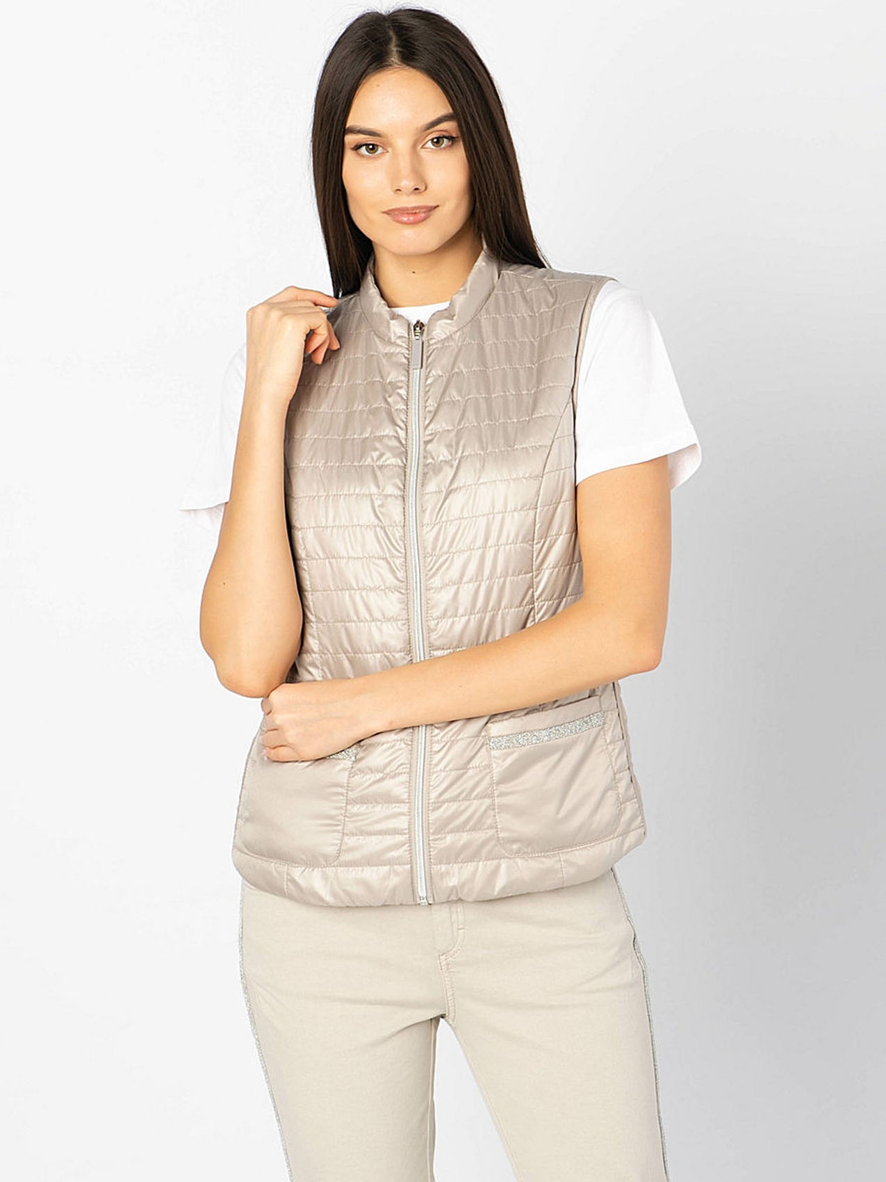 Великолепный стеганый жилет из легких синтетических волокон. Небольшой воротник-стоечка. Замок по всей длине и карманы спереди обеспечивают удобство. Завершает дизайн декоративная лента на карманах.