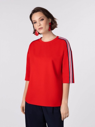 Блуза из трикотажа прямого силуэта с круглой горловиной, спущенным плечом и укороченным втачным рукавом. На плечевых и боковых швах контрастная декоративная тесьма в полоску.