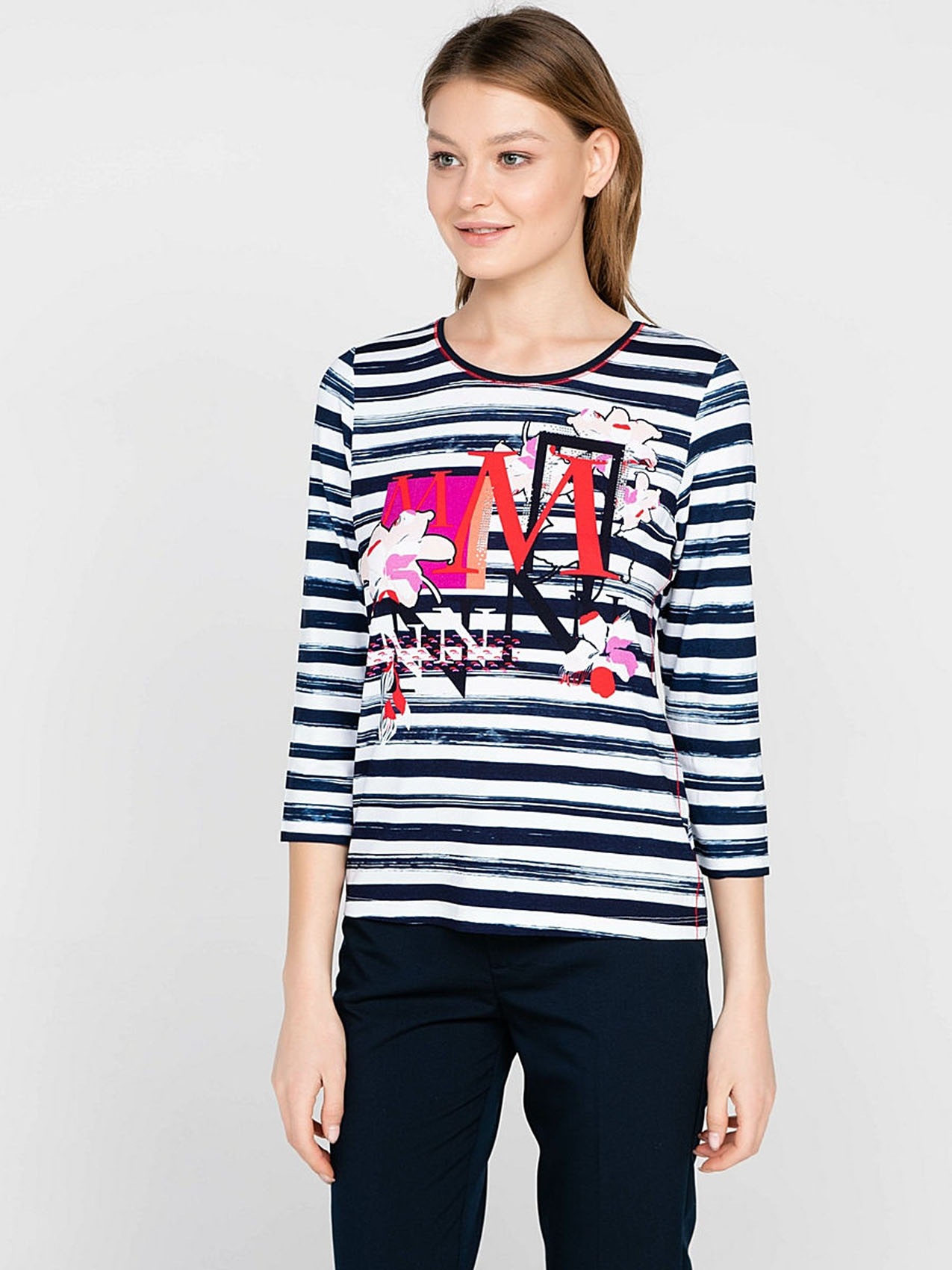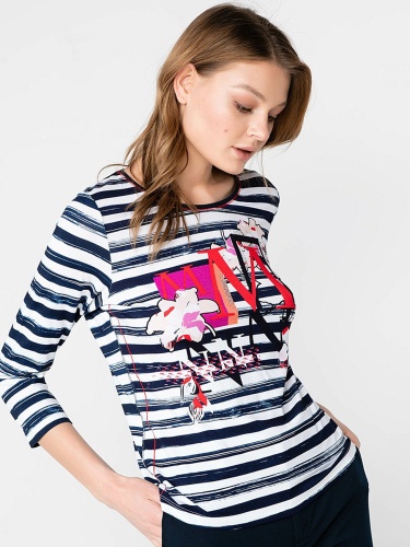 Полосатый дизайн и тропические цветы - то, что нужно для летнего образа! С брюками или с юбкой - эта футболка одинаково удачно выражает индивидуальность своей обладательницы. Приятный к телу материал из смеси вискозы и эластана гарантирует отличную посадку, а рукав 3/4 придает образу легкость и непринужденность. Длина изделия по спинке - 62 см.