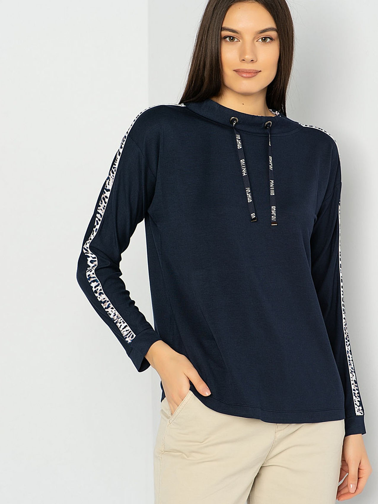 Футболка-лонгслив с манжетами. Приятный к телу материал из смеси вискозы, модала и эластана гарантирует отличную посадку, а прямой крой и рукав с опущенным плечом обеспечивают свободу движений. Полосы на плечах и рукавах и завязки на воротнике завершают дизайн и придают спортивный вид. Интересная деталь дизайна футболки - леопардовый принт на подкладке воротника.