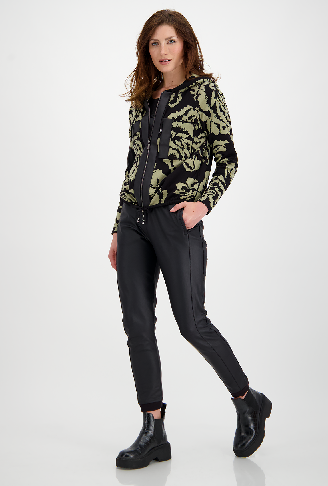 Джемпер на молнии с капюшоном – яркий вариант для образа в стиле кэжуал. Актуальная цветовая гамма и трендовый растительный принт. Рукав-реглан полной длины, один из рукавов украшает лампас. Ассиметричные вставки на груди, по низу изделия кулиска.