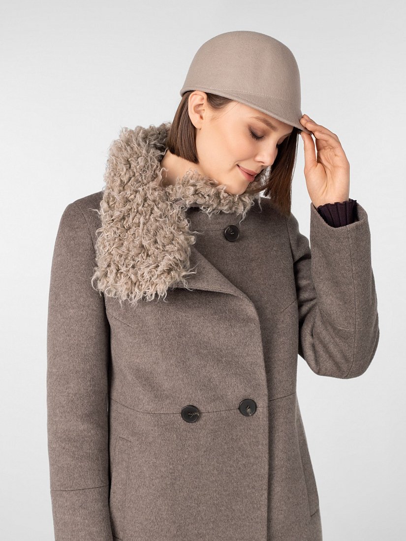 Пальто прямого силуэта длиной чуть ниже колена. Втачной рукав, застёжка на роговые пуговицы, широкий воротник-стойка, вертикальные карманы-листочки. Горизонтальные подрезы на полочке, спинке и рукавах. Съёмный воротник-стойка из искусственного меха. Произведено с ветрозащитной мембраной Raft Pro. Утеплитель DuPont Sorona из биопуха. Изготовлено из шерстяной ворсовой ткани цвета "бежевый меланж".