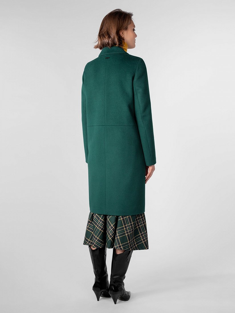 Пальто прямого силуэта длиной выше колена. Втачной рукав, застёжка на пришивные кнопки, английский воротник, горизонтальный подрез на полочке и спинке, вертикальные карманы-листочки. Ветрозащитная мембрана Raft Pro. Изготовлено из ворсовой шерстяной ткани изумрудного цвета.