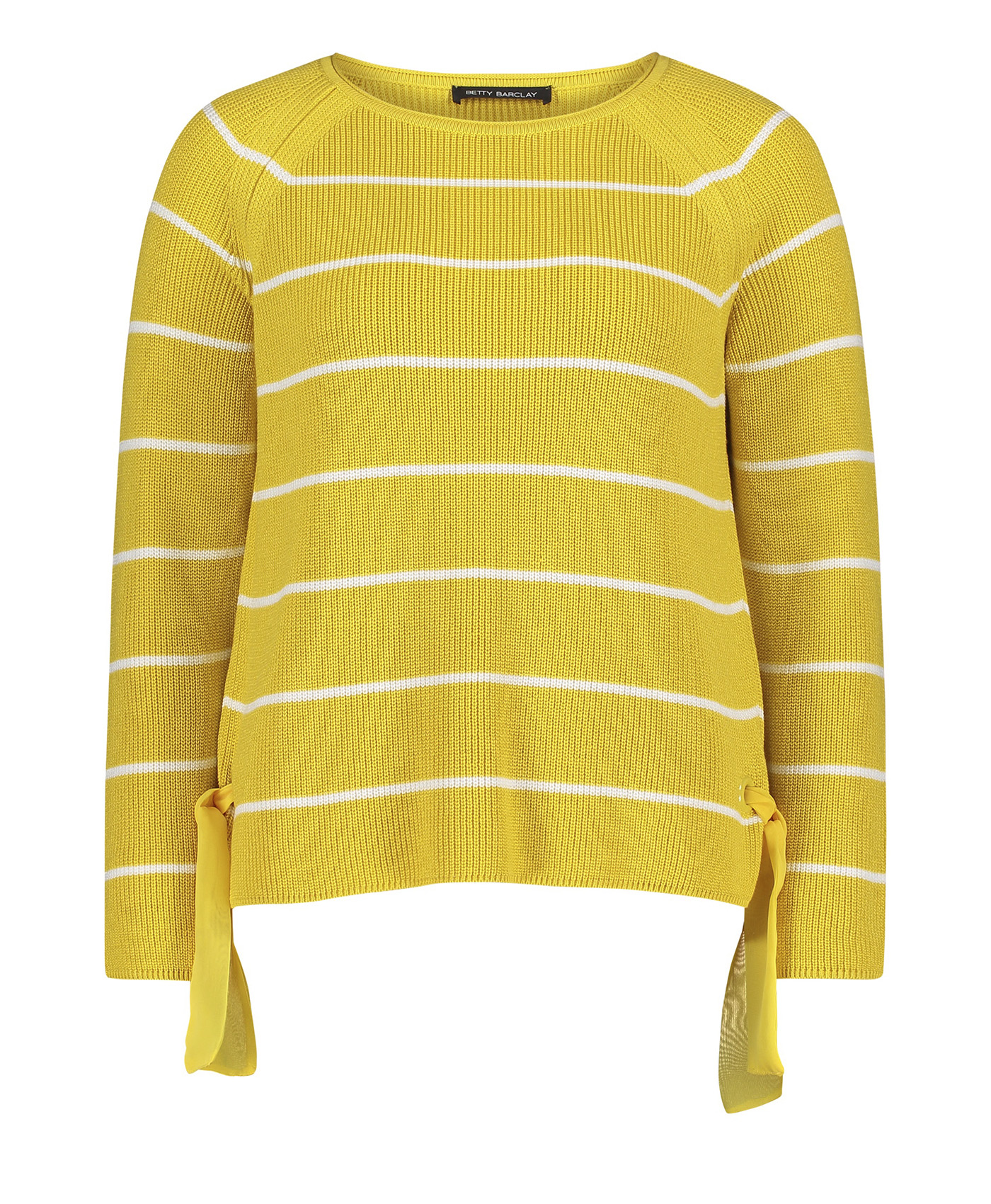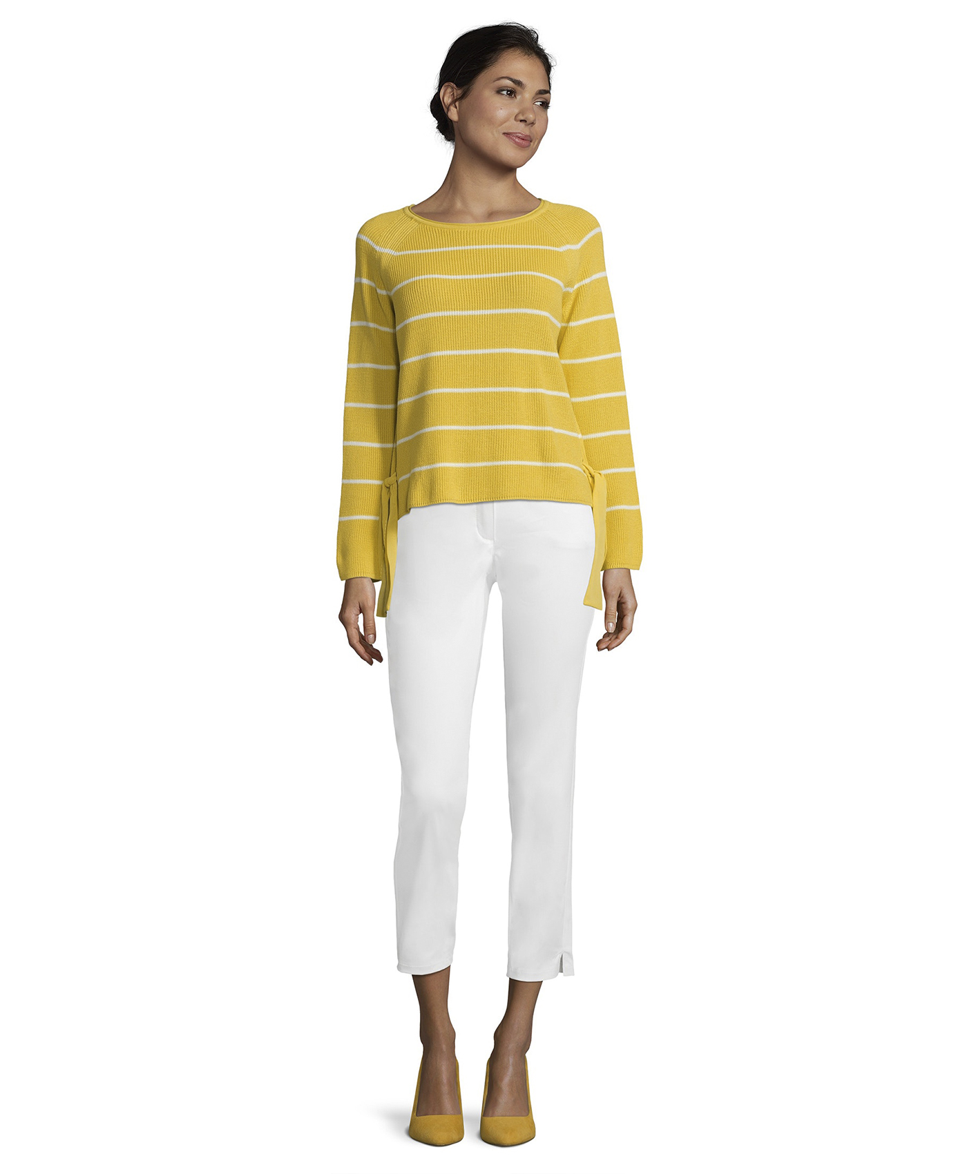 Новая вариация трендовой полоски! Джемпер прямого покроя с длинными рукавами и горловиной-лодочкой. Элемент романтического стиля - декоративные ленты-завязки по бокам. Материал из хлопковой смеси приятен к телу. Этот джемпер создает женственный образ даже в сочетании с брюками.