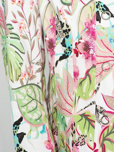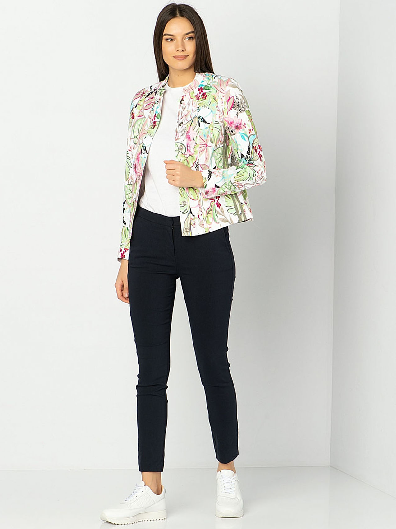 Светлый жакет с цветочным принтом создает весеннее настроение, так что даже в хмурый день ваша улыбка будет сиять. Хлопковый материал с примесью эластана обеспечивает комфорт и отличную посадку. Слегка приталенный силуэт, воротник-стойка и кнопки - то, что нужно для отличного дизайна. Эта модель удачно сочетается как с брюками, так и с юбкой. Свежие цвета сделают ваш образ ярким!