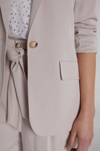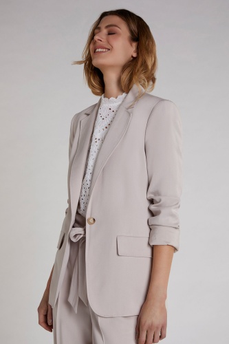 Однотонный жакет - универсальная модель гардероба. Слегка приталенный силуэт. Отложной воротник с лацканами, застежка на пуговице. Вискозный материал приятен к телу и обеспечивает комфорт. Эта модель лаконична по дизайну, что делает ее базой как для делового, так и для повседневного образа.
