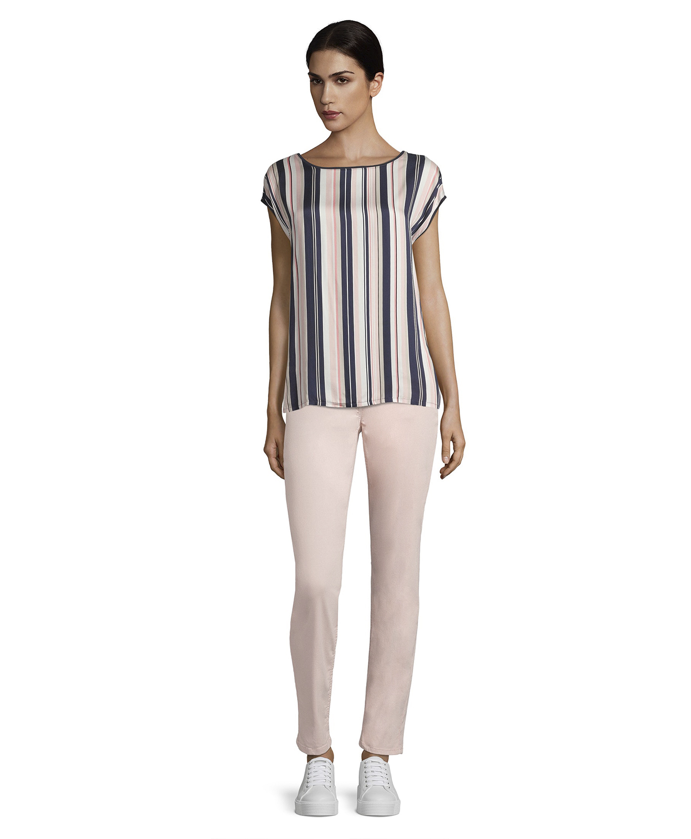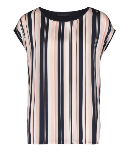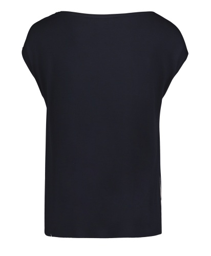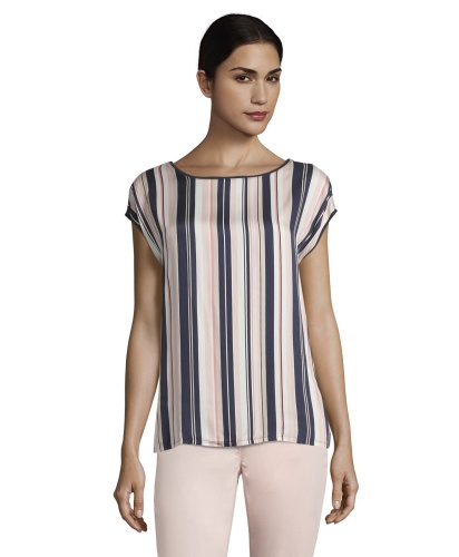 Топ в полоску - универсальная вещь в вашем гардеробе! Прямой покрой, короткие цельнокроеные рукава и вырез-лодочка создают непринужденный образ. Спинка изделия выполнена из однотонного материала. Вискозная смесь приятна к телу и обеспечивает комфорт. Этот топ идеально сочетается с любым однотонным низом и обувью.