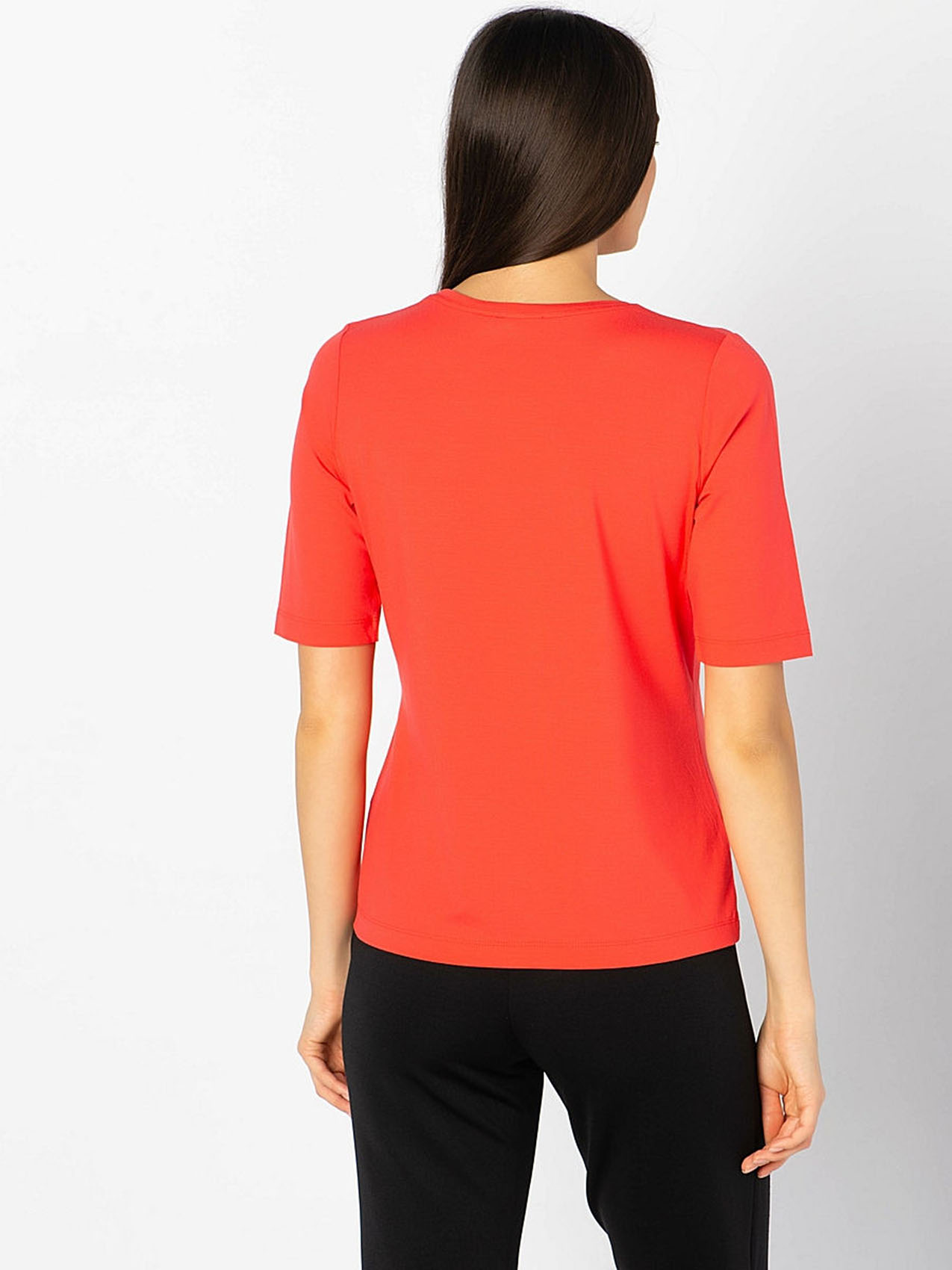 Яркие краски лета - для вас! Футболка трендового цвета с серебристым цветочным принтом. Мягкий материал из смеси вискозы и эластана гарантирует отличную посадку, а рукав 1/2 придает образу легкость и непринужденность. Слегка приталенный силуэт подчеркивает женственность. Универсальная футболка прекрасно смотрится как с классическим костюмом, так и со спортивным.