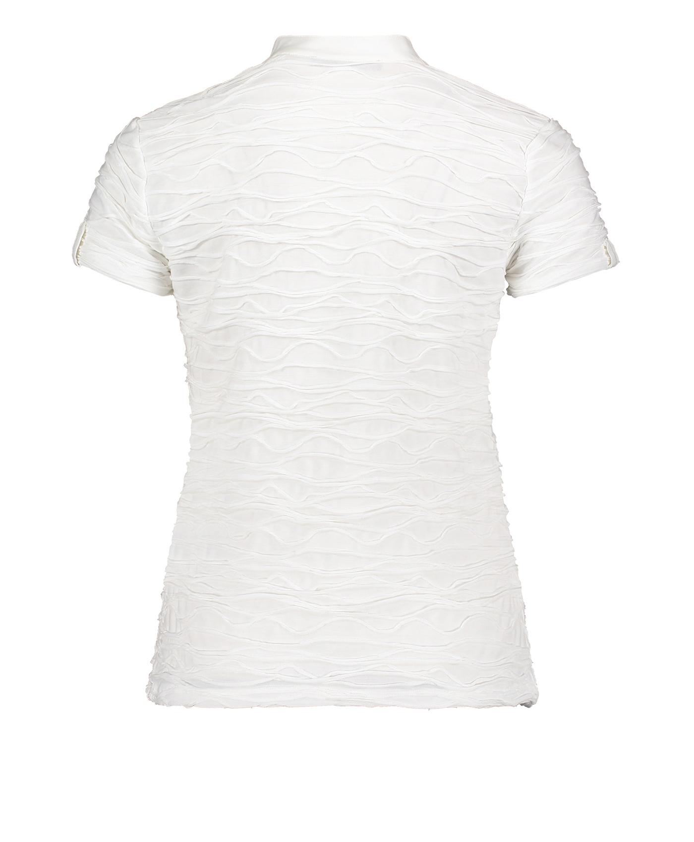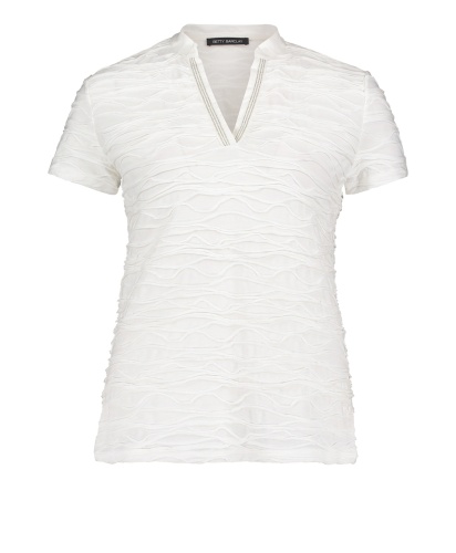 Однотонная футболка прямого покроя - абсолютно необходимая вещь в гардеробе. Короткие рукава, V-образный вырез горловины с отделкой тесьмой. Интересная фактура ткани привлекает внимание. Футболка отлично сочетается как с брюками, так и с юбкой.