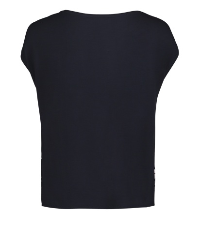 Футболка с геометрическим принтом - универсальная вещь в вашем гардеробе! Прямой покрой, короткие цельнокроеные рукава и вырез-лодочка создают непринужденный образ. Спинка изделия выполнена из однотонного материала. Вискозная смесь приятна к телу и обеспечивает комфорт. Эта футболка идеально сочетается с любым однотонным низом и обувью.