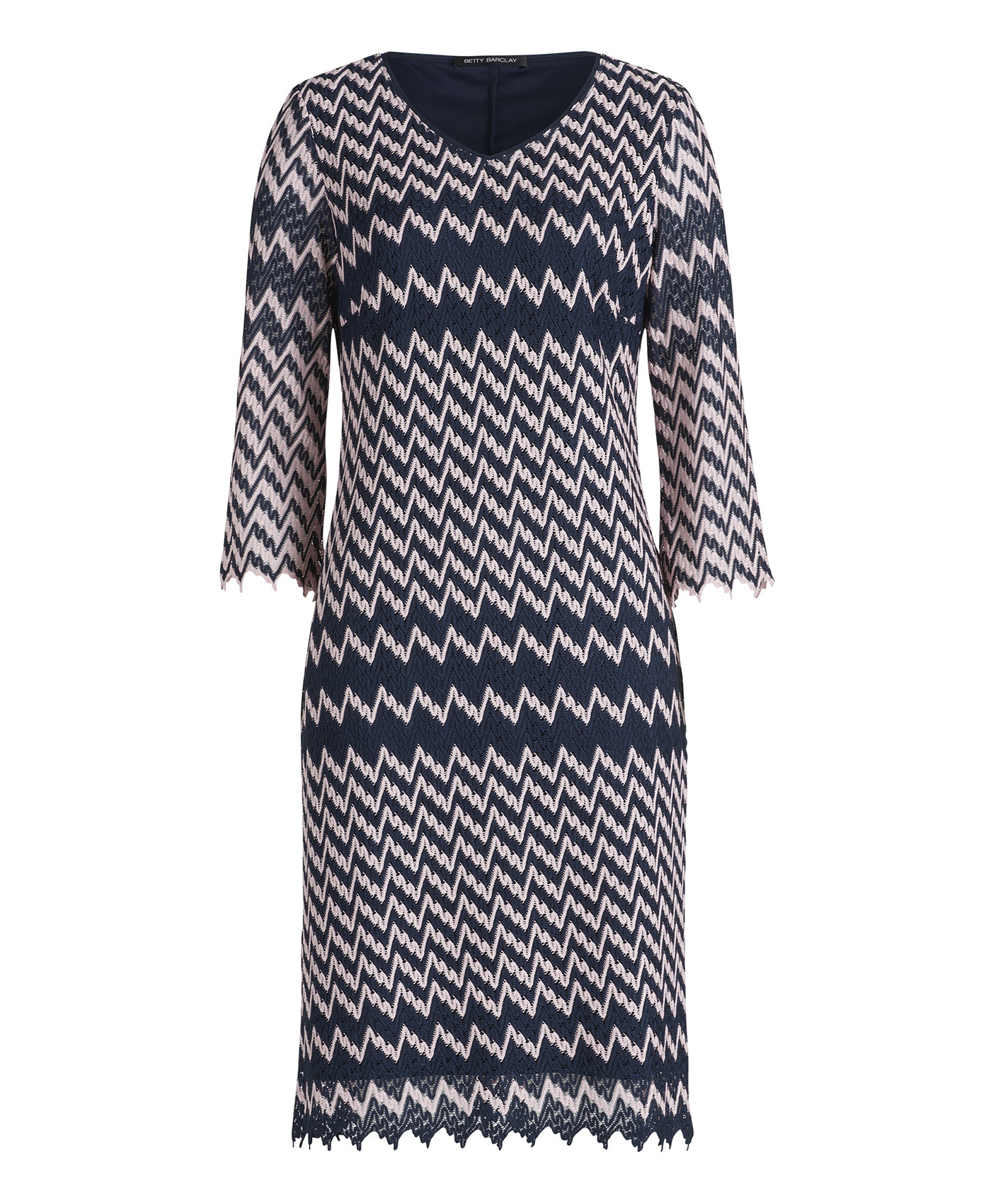 Платье с графическим узором - тренд сезона! Слегка приталенный силуэт, V-образный вырез горловины, рукава 3/4. Ажурный материал платья создает романтичный, женственный образ независимо от того, в туфлях вы или в кроссовках.