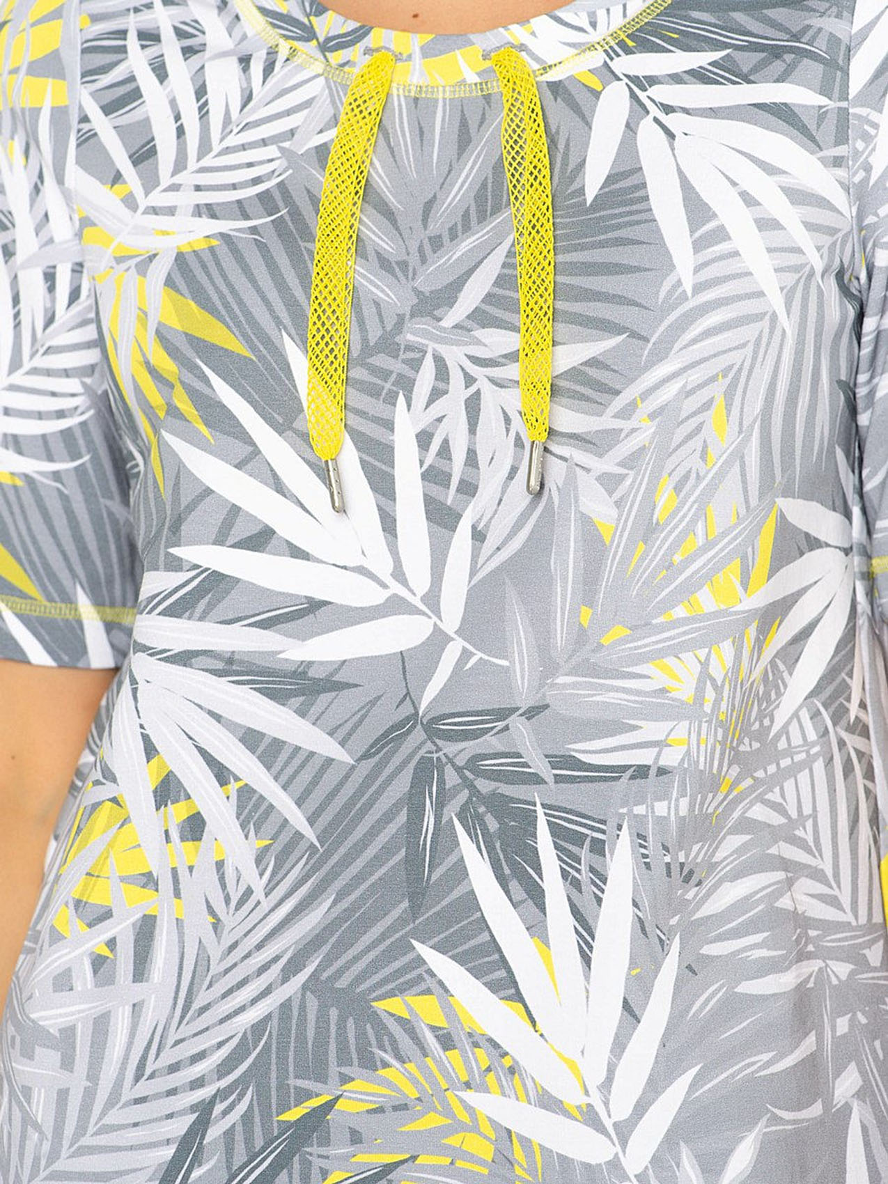 Платье миди. Круглый вырез горловины с желтыми завязками. Рукав 1/2. Удлиненная спинка, небольшие разрезы по бокам, отделка по низу изделия. Принт с тропическими мотивами, яркие цветовые акценты. Приятный к телу материал из смеси хлопка и эластана.