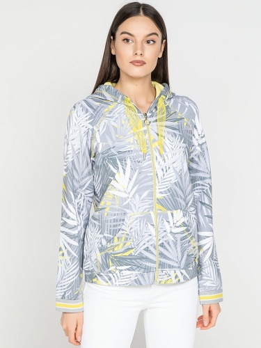 Блейзер с капюшоном. Трендовый принт с тропическими мотивами. Длинные рукава с трикотажными манжетами. Прорезные карманы. Замок-молния. Приятный к телу материал из смеси хлопка и эластана. Длина изделия по спинке: 67 см.