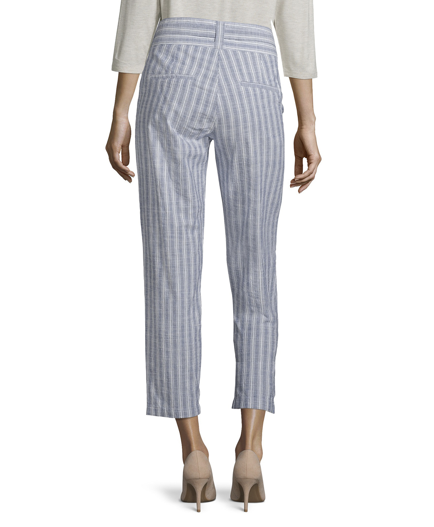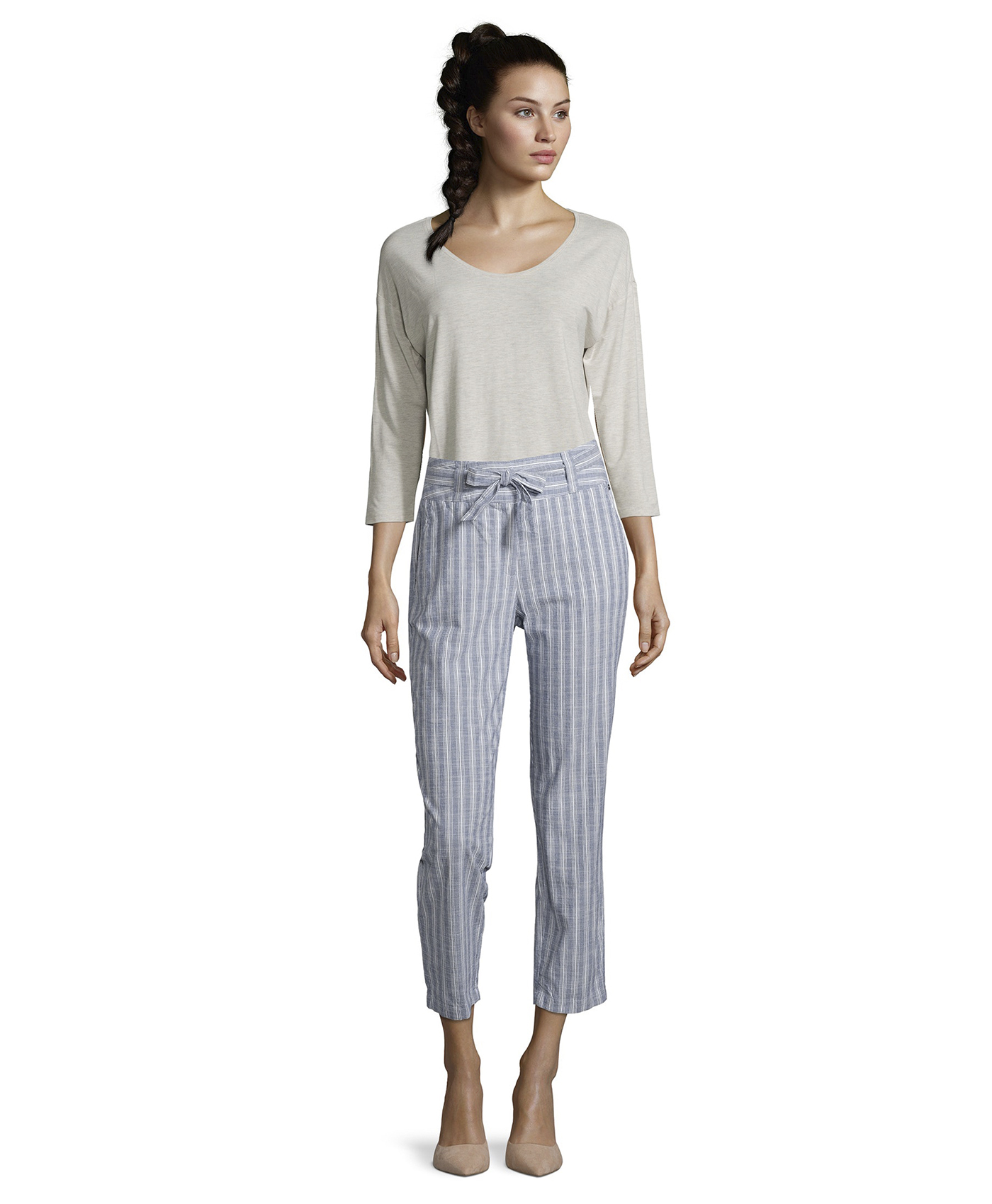 Брюки прямого кроя. Полосатый принт визуально удлиняет ноги. Длина 7/8 позволяет подчеркнуть модную обувь. Элегантная деталь модели - пояс-бант. Приятный к телу материал из смеси хлопка и льна обеспечивает комфорт в ношении. Эти брюки гарантируют трендовый образ в сочетании с любым верхом и обувью.