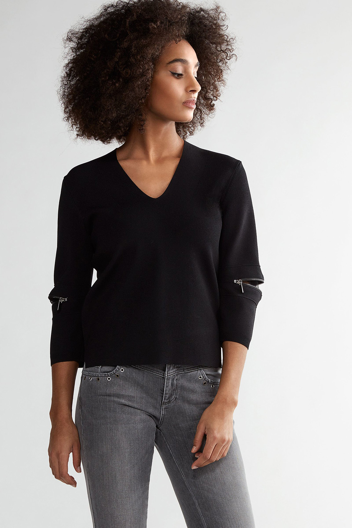 Джинсовые брюки с потертостями. Средняя посадка, силуэт slim подчеркивает стройные ноги. Укороченная длина брюк акцентирует внимание на модной обуви. Другие элементы дизайна - карманы, декоративные отверствия с люверсами, разрезы с внутренней стороны, открытый нижний срез брюк с бахромой. Приятный к телу материал из хлопковой смеси обеспечивает комфорт в ношении.