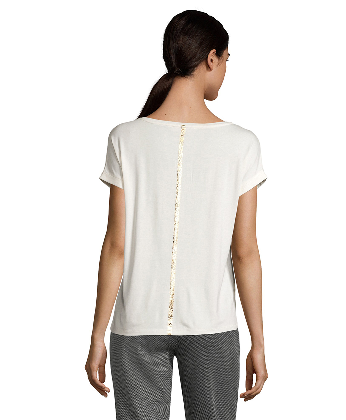 Топ с абстрактным принтом создает яркий образ. Прямой покрой, круглый вырез горловины, короткие рукава с фиксированными манжетами. Спинка изделия выполнена из однотонного материала с металлизированным принтом. Приятный к телу материал из вискозной смеси обеспечивает комфорт. Этот топ прекрасно смотрится в любом комплекте одежды.