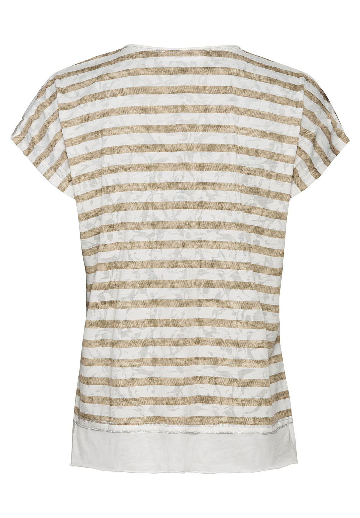 Стильная футболка Julie. Лицевая сторона украшена женственным цветочным принтом и надписью из страз. Принт в полоску на спинке изделия. Широкий низ футболки с боковыми разрезами. U-образный вырез, цельнокроеный рукав придают образу свободу и непринужденный вид. Абсолютная модная вещь для модных образов! • цветочный принт с надписью, стразы • приятный к телу материал с вискозой в составе • однотонный низ, цельнокроеный рукав • U-образный вырез, слегка приталенный силуэт • длина около 64 см