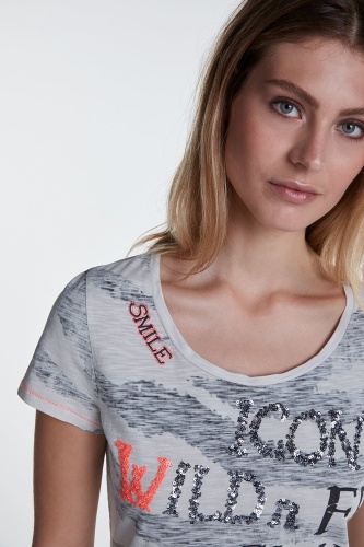 Футболка полуприлегающего силуэта с анималистическим принтом и пайетками. Круглый вырез горловины, короткие втачные рукава, декоративная отстрочка контрастного цвета. Приятный к телу хлопковый материал обеспечивает комфорт.