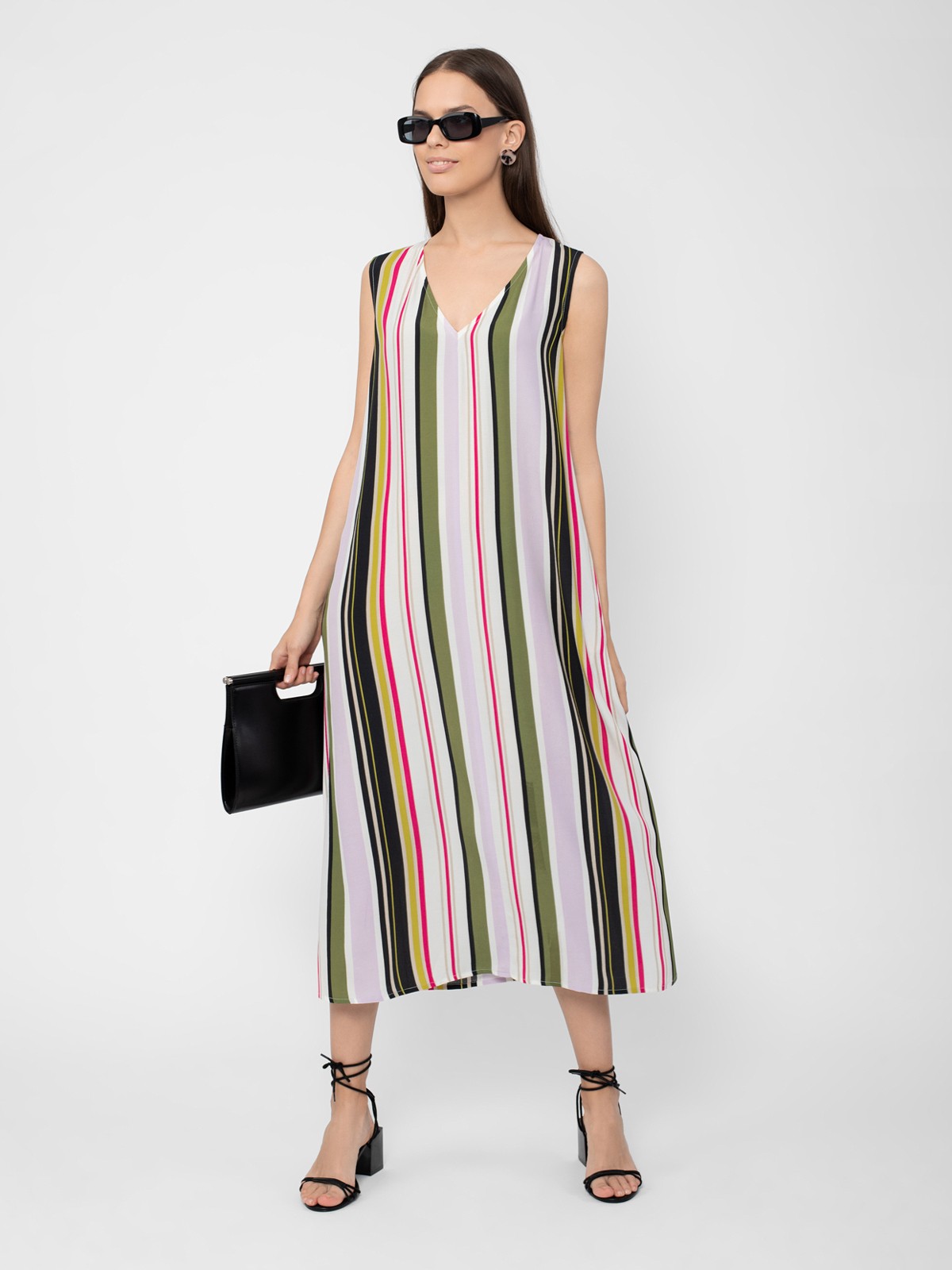 Платье из вискозы в принте полуприлегающего силуэта без рукавов с v-образным вырезом горловины.