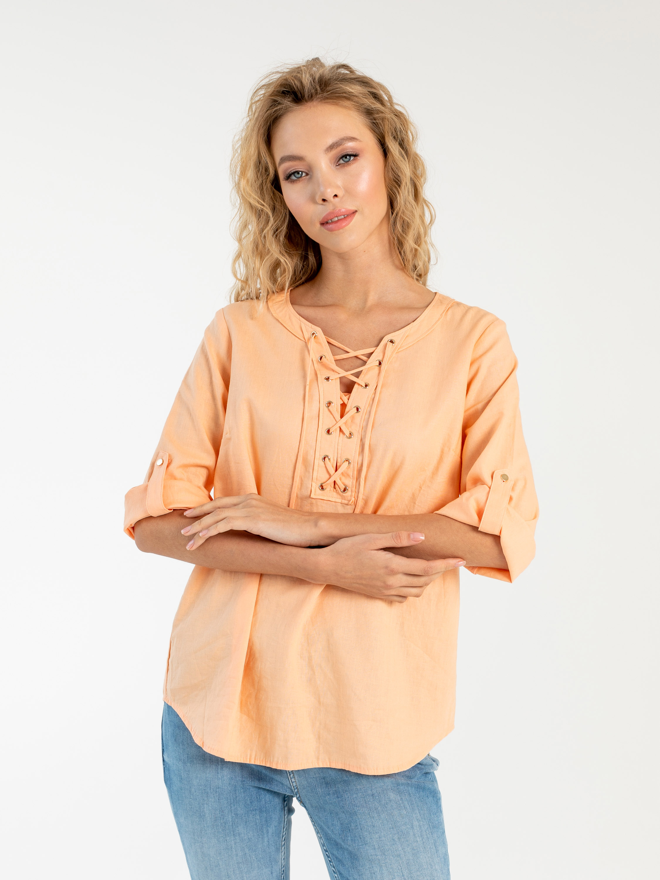 На сайте указаны российские размеры. Ткань: смесовая – лен и хлопок, максимально приятная телу. Крой: Свободный силуэт и встречная складка под кокеткой на спине дарят бесконечный комфорт и свободу движения. Функциональный пат позволяет добиться нужной длины рукава и надежно фиксирует желаемый уровень. Отделка: красивая шнуровка на груди – главное украшение блузки, придающая очарования и легкости бохо-стиля. Золотистые наконечники шнурка прекрасно подходят к цвету блузки. Скругленный низ изделия гармонирует с круглым воротом верха, создавая идеальные пропорции. Лучшим компаньоном блузке станут джинсы или брюки прямого или расклешенного силуэта из коллекции Stern.