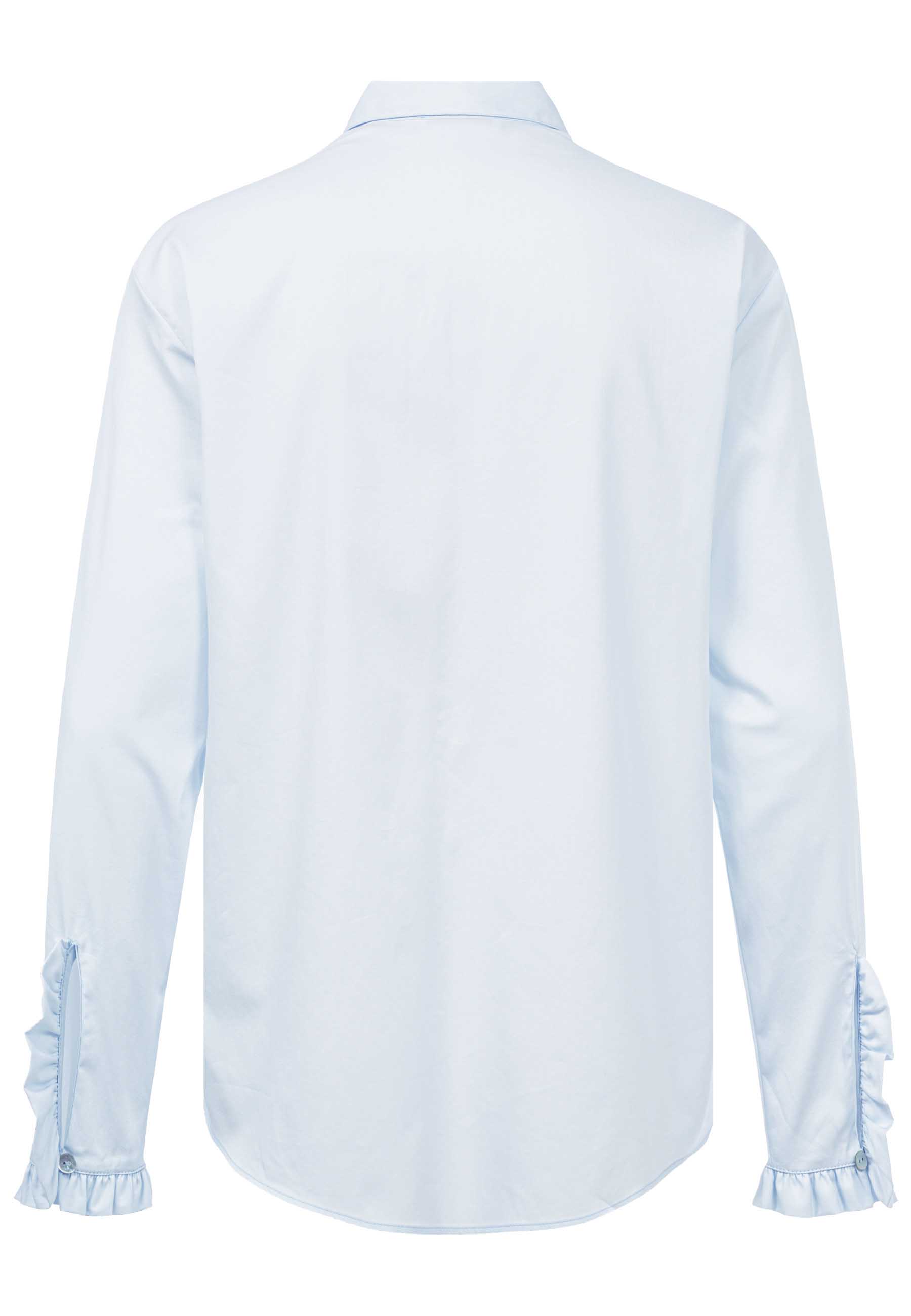 На сайте указаны российские размеры. Модная блуза с длинными рукавами и планкой на потайных пуговицах. Закругленный низ, удлиненный сзади, придает блузке струящийся легкий вид. Классический отложной воротник в сочетании с планкой на потайных пуговицах. Наша модель ростом 177 см. Измерения для 44 размера: Окружность груди: 106 см Талия: 106 см Бедра: 114 см Длина по спинке: 72 см. Длина рукава: 60 см.