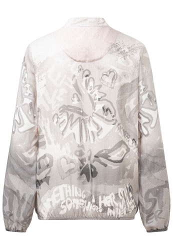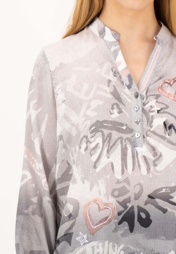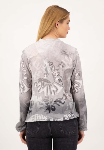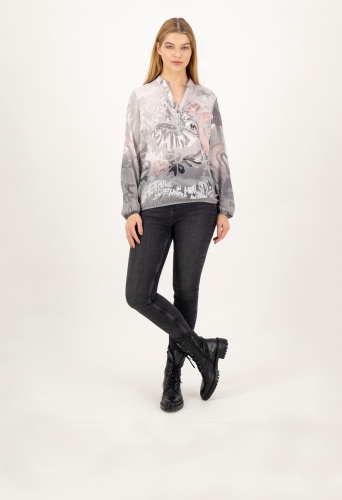 На сайте указаны российские размеры. Модная блуза с длинными рукавами и блестящими аппликациями из 100% вискозы. Эластичные ленты на кромке и манжетах рукавов также обещают высокий уровень комфорта. Наша модель ростом 177 см. Измерения для 44 размера: Окружность груди: 104 см Талия: 102 см Обхват бедер: 112 см. Длина по спинке: 62 см. Длина рукава: 62 см.