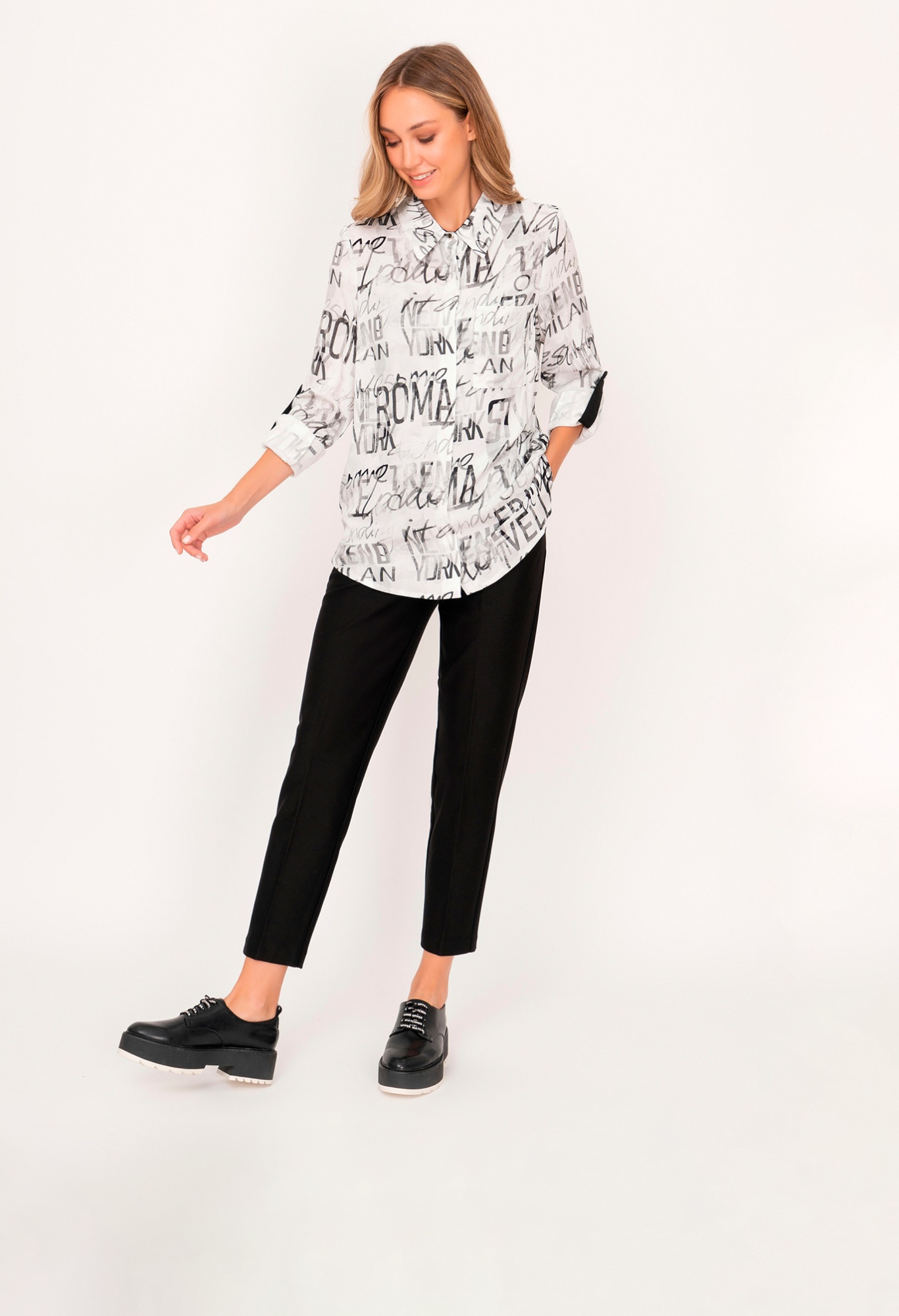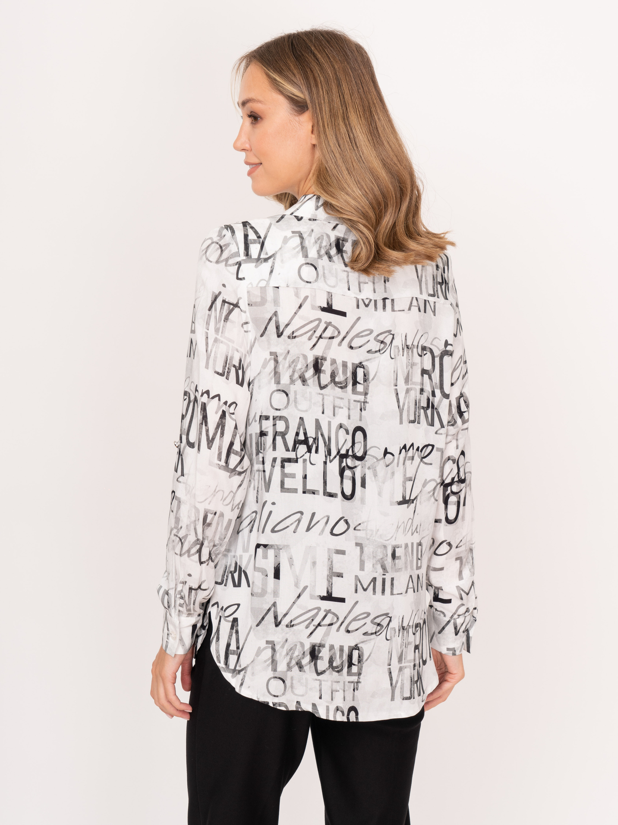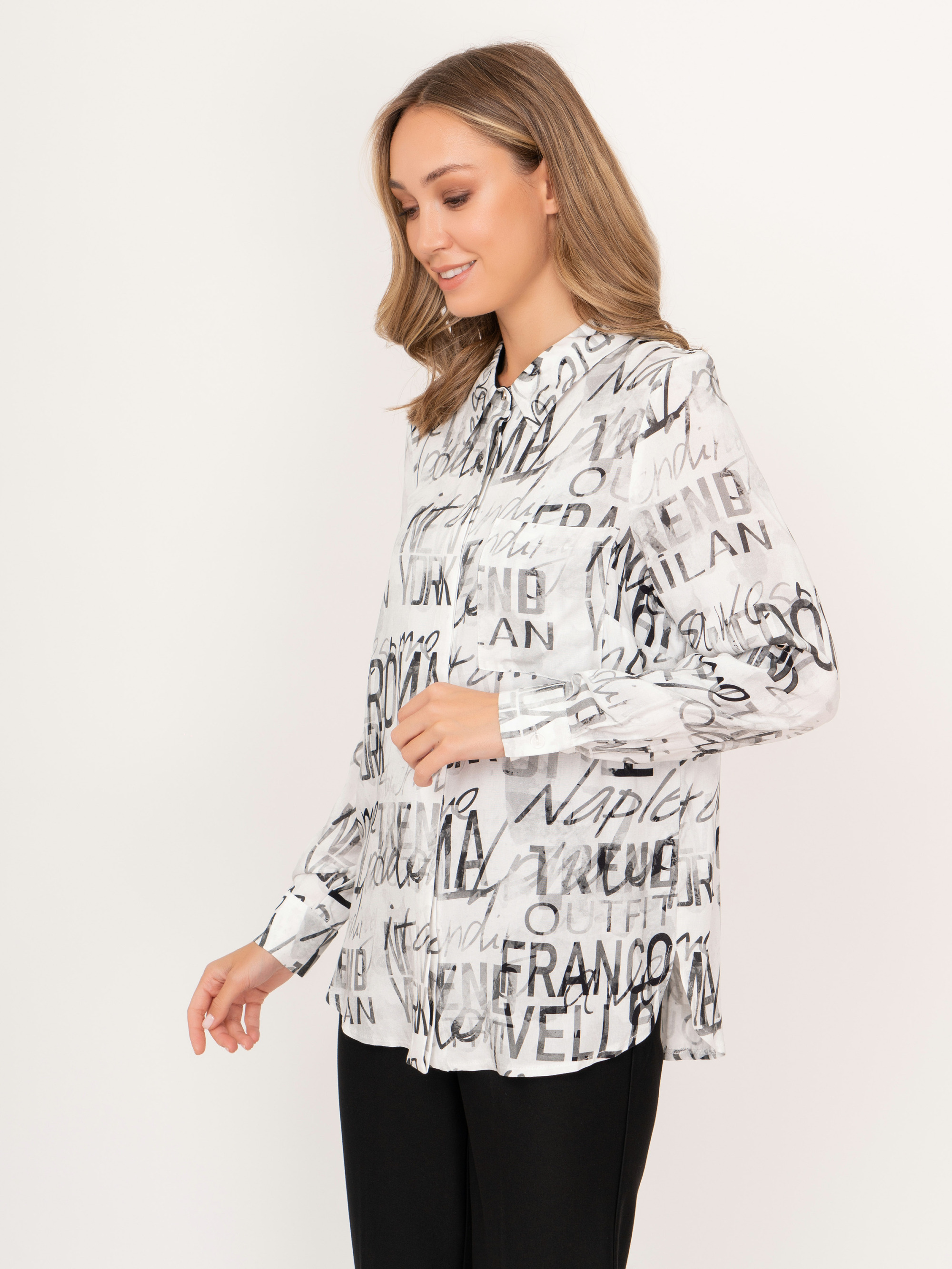На сайте указаны российские размеры. Прямая серая блузка из вискозы на пуговицах, с отложным воротником, с длинным рукавом на манжете, с надписями. Рост модели: 175 см. Длина по спинке: 70 см.