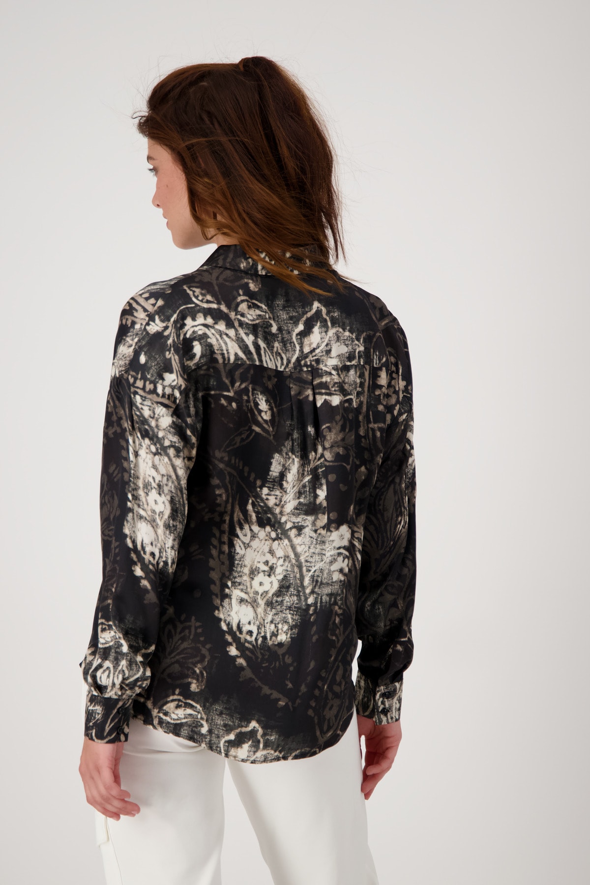 На сайте указаны российские размеры. Блузка с воротником-стойкой и принтом пейсли по всей поверхности. Рубашка-фасон с классическим рубашечным воротником, блуза-рубашка прямого кроя с удлиненной спиной и закругленным низом. Планка с пуговицами, манжеты на двух пуговицах на концах рукавов и кокетка со стильной коробчатой складкой на спине завершают дизайн изящно струящейся модели. Не отказывайтесь от эксклюзивной модели из вискозы с принтом пейсли по всей поверхности. Отлично подойдут к светлым брюкам в стиле карго с модными кроссовками. Рост модели 175 см. Длина по спинке 44 размера составляет 74 см, а по переду – 70 см.