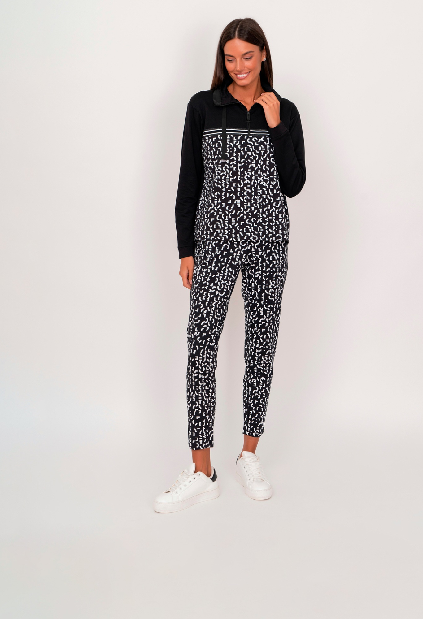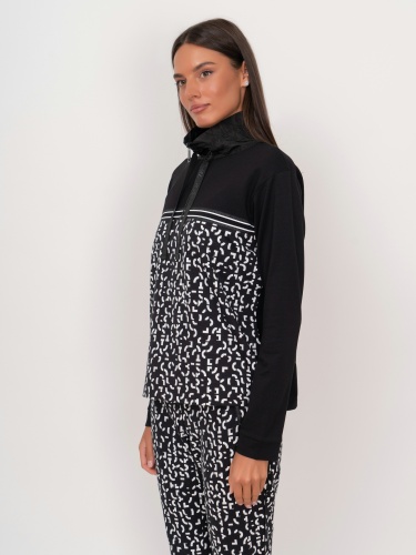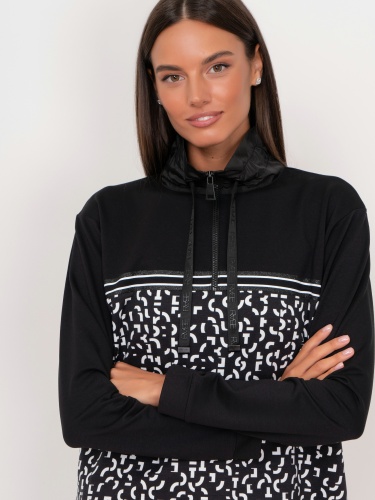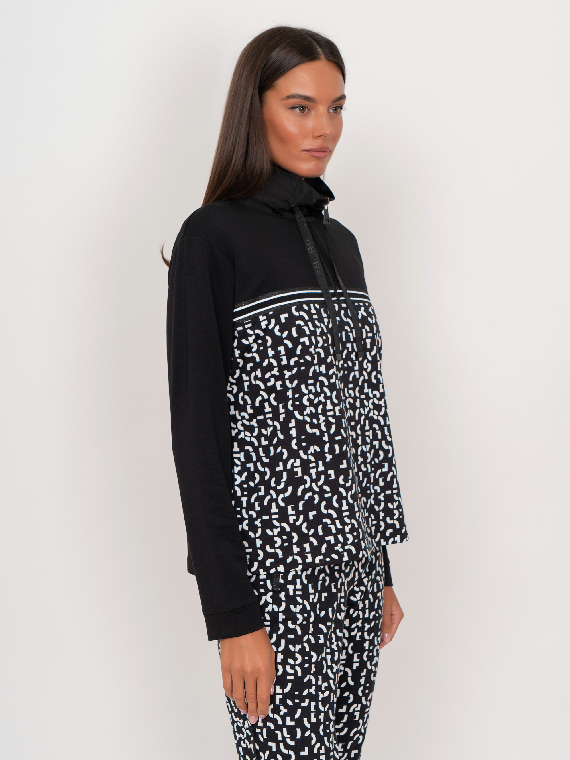 На сайте указаны российские размеры. Трикотажный черный джемпер, с воротником-стойка из текстиля на молнии и завязках, с длинным рукавом, с полоской, с абстрактным белым рисунком. Рости модели: 175 см. Длина блузы: 58 см.