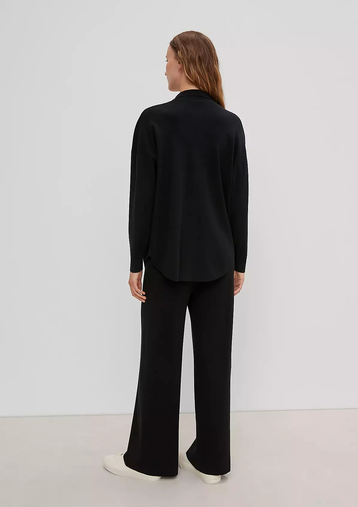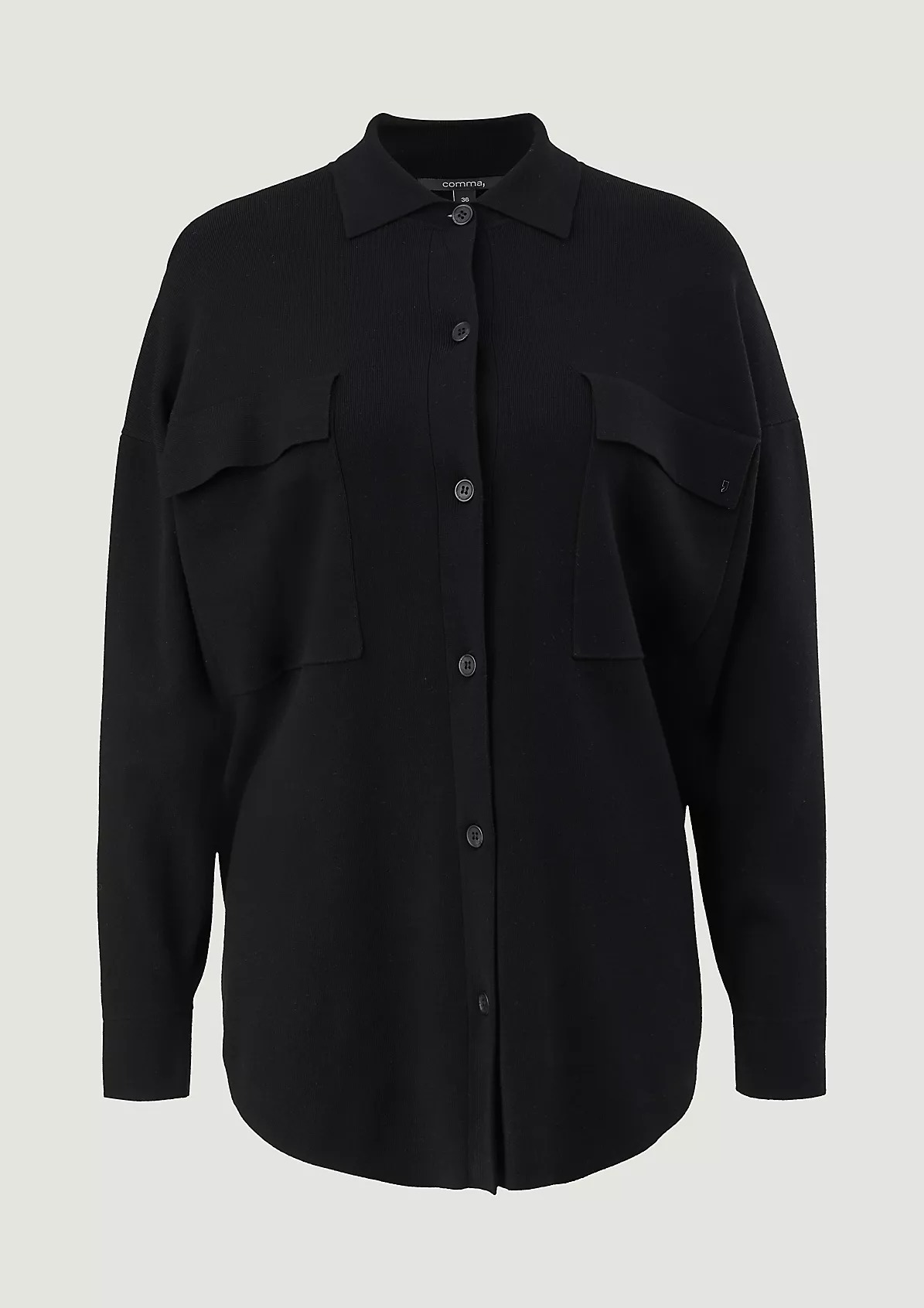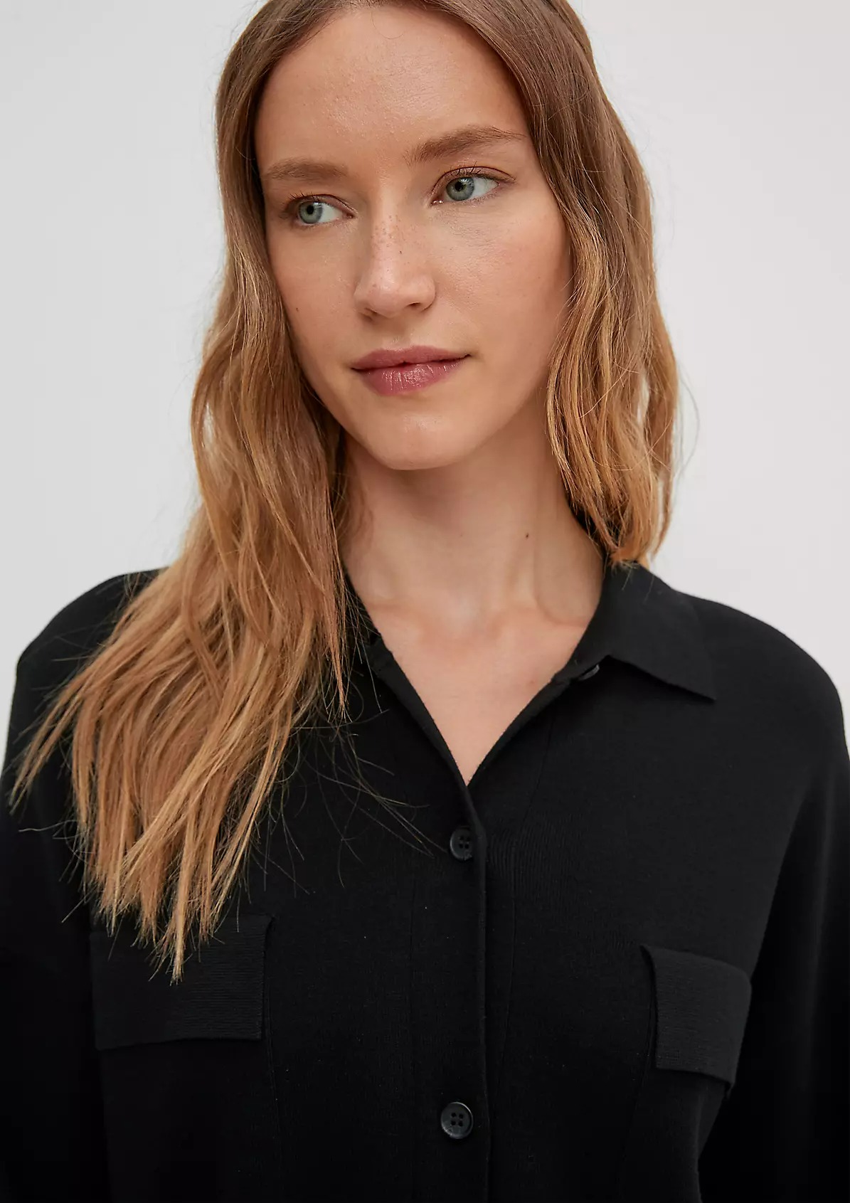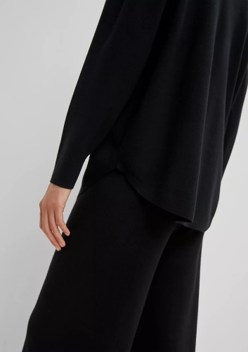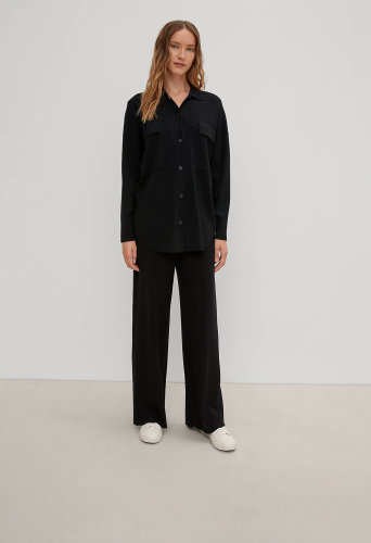 На сайте указаны российские размеры. Однотонная блуза с отложным воротником и планкой с пуговицами. Впереди нагрудный карман. Закругленный подол. Длина по спинке для размера 42 около 77 см.