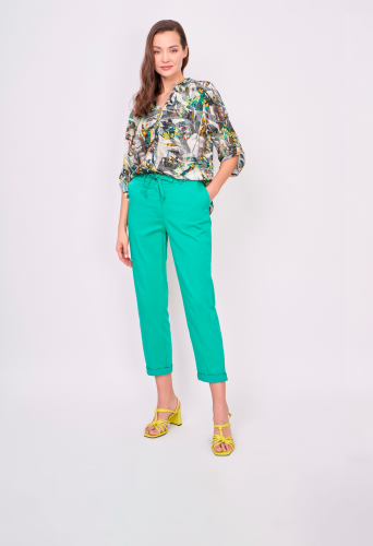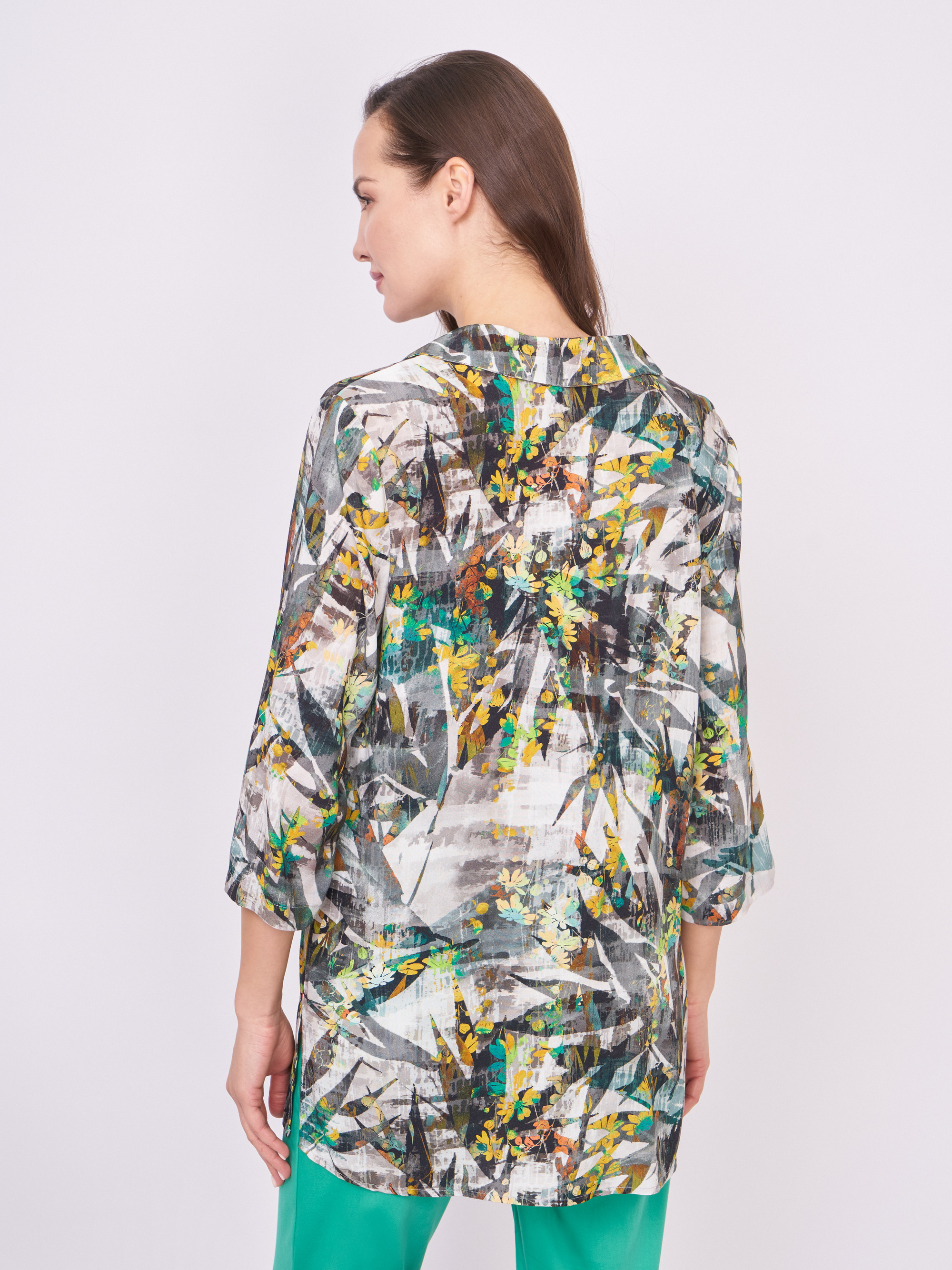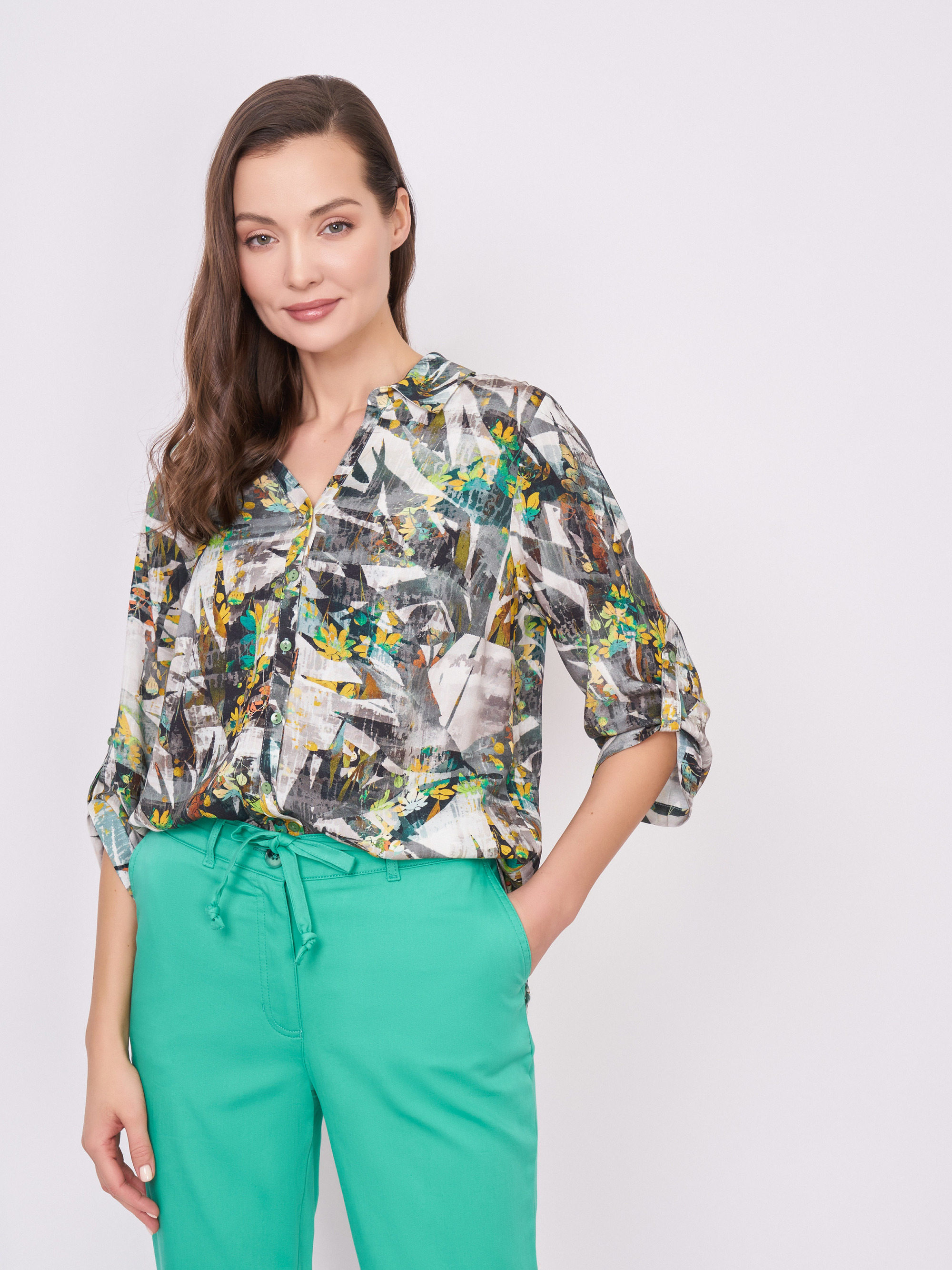 На сайте указаны российские размеры. Текстильная прямая зелено-серая блузка на пуговицах, с отложным воротником, с укороченным рукавом 3/4, с цветочным рисунком. Длина по спинке: 77 см. Рост модели: 177 см.