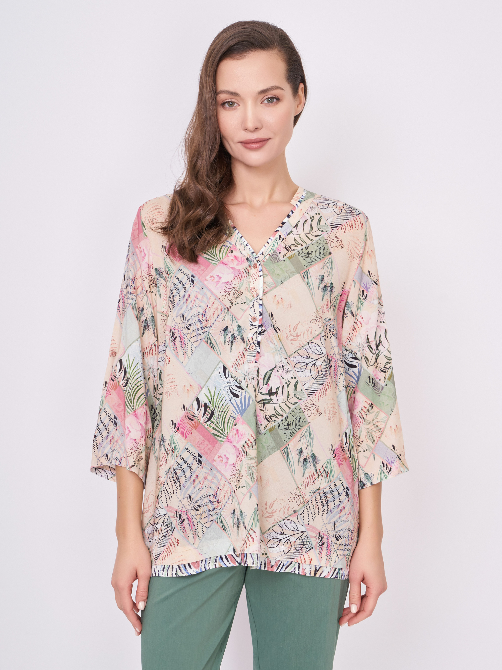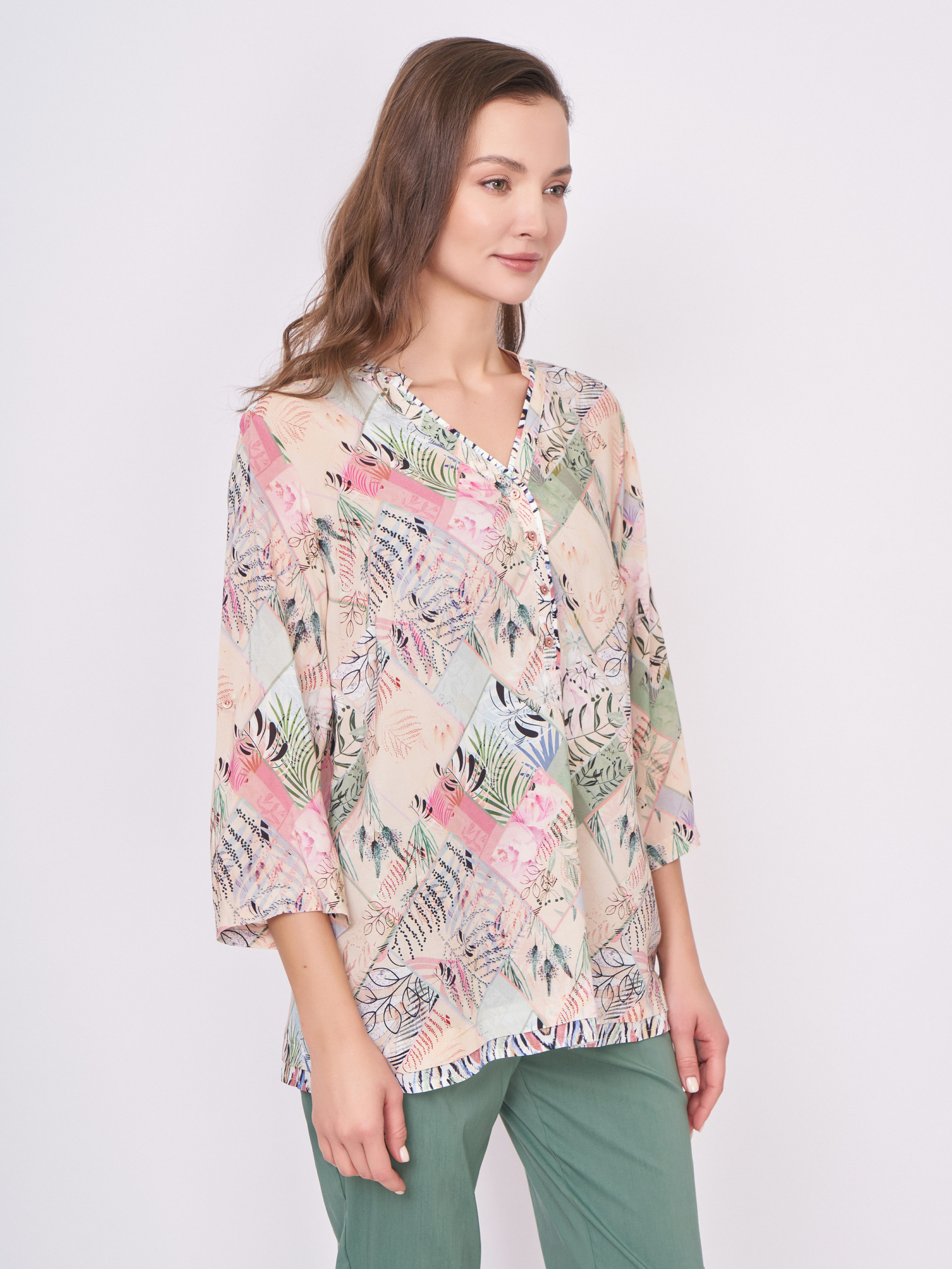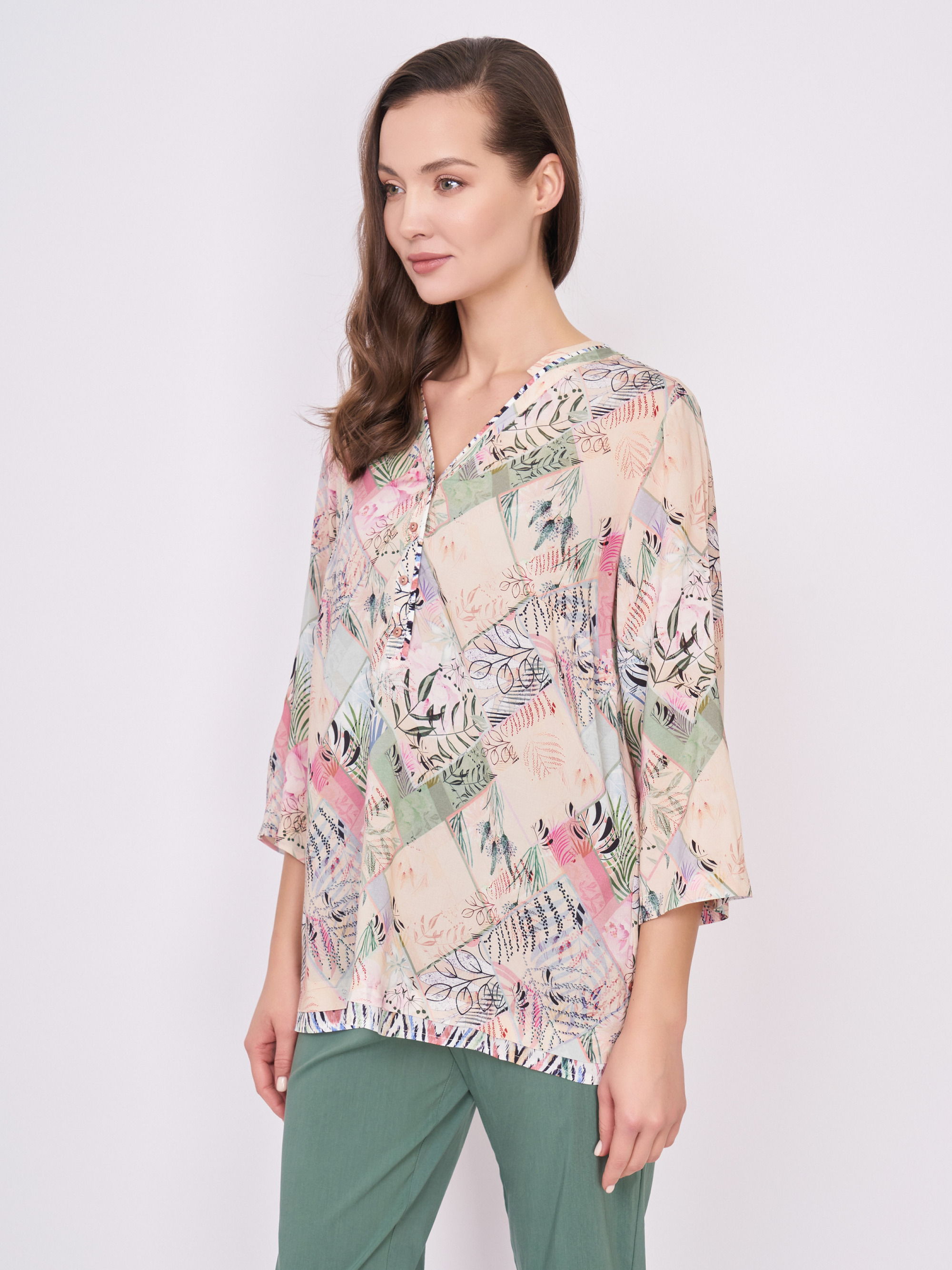 На сайте указаны российские размеры. Прямая текстильная персиково-розово-зеленая блузка на пуговицах, с V-образным вырезом, с укороченным рукавом 3/4, с цветочным рисунком. Длина по спинке: 66 см. Рост модели: 177 см.