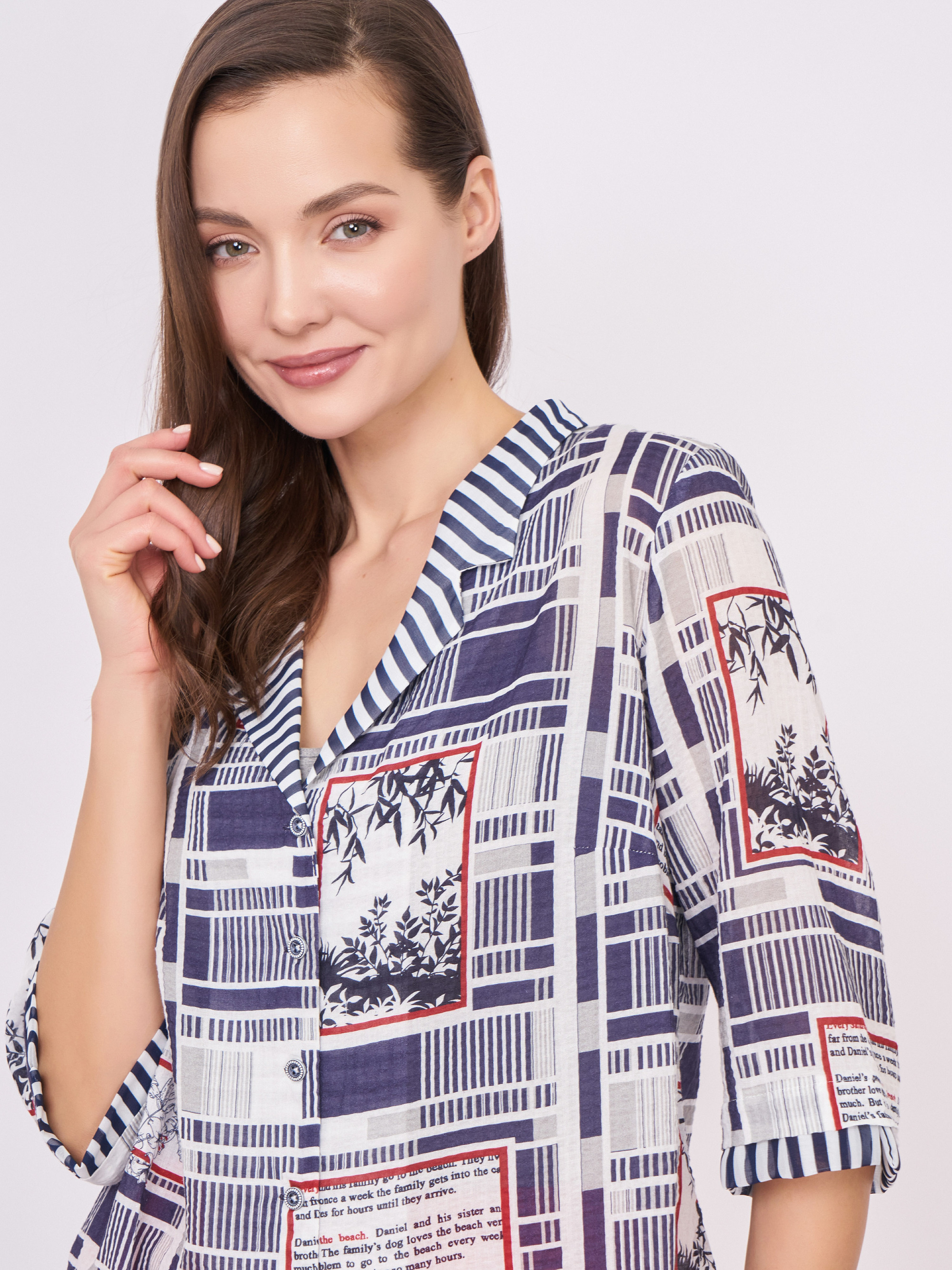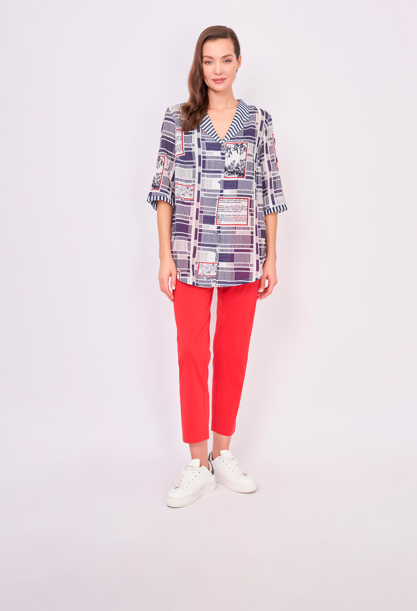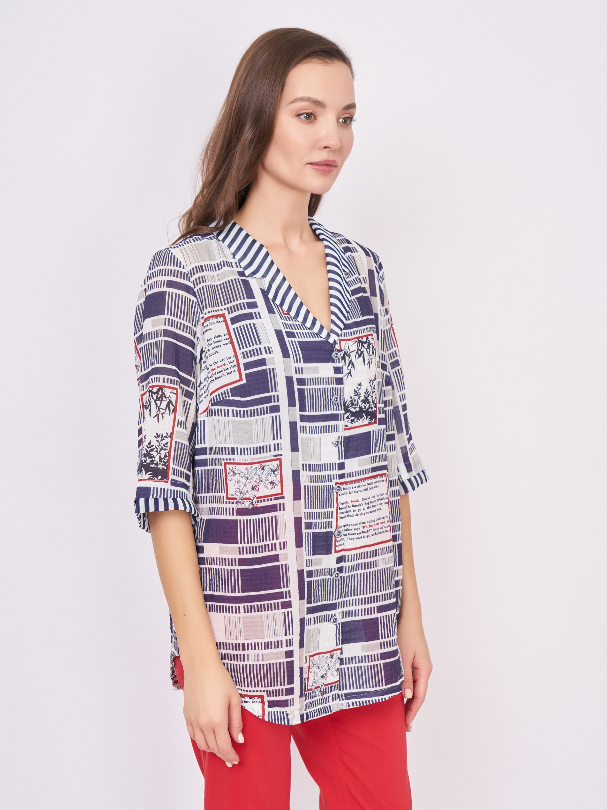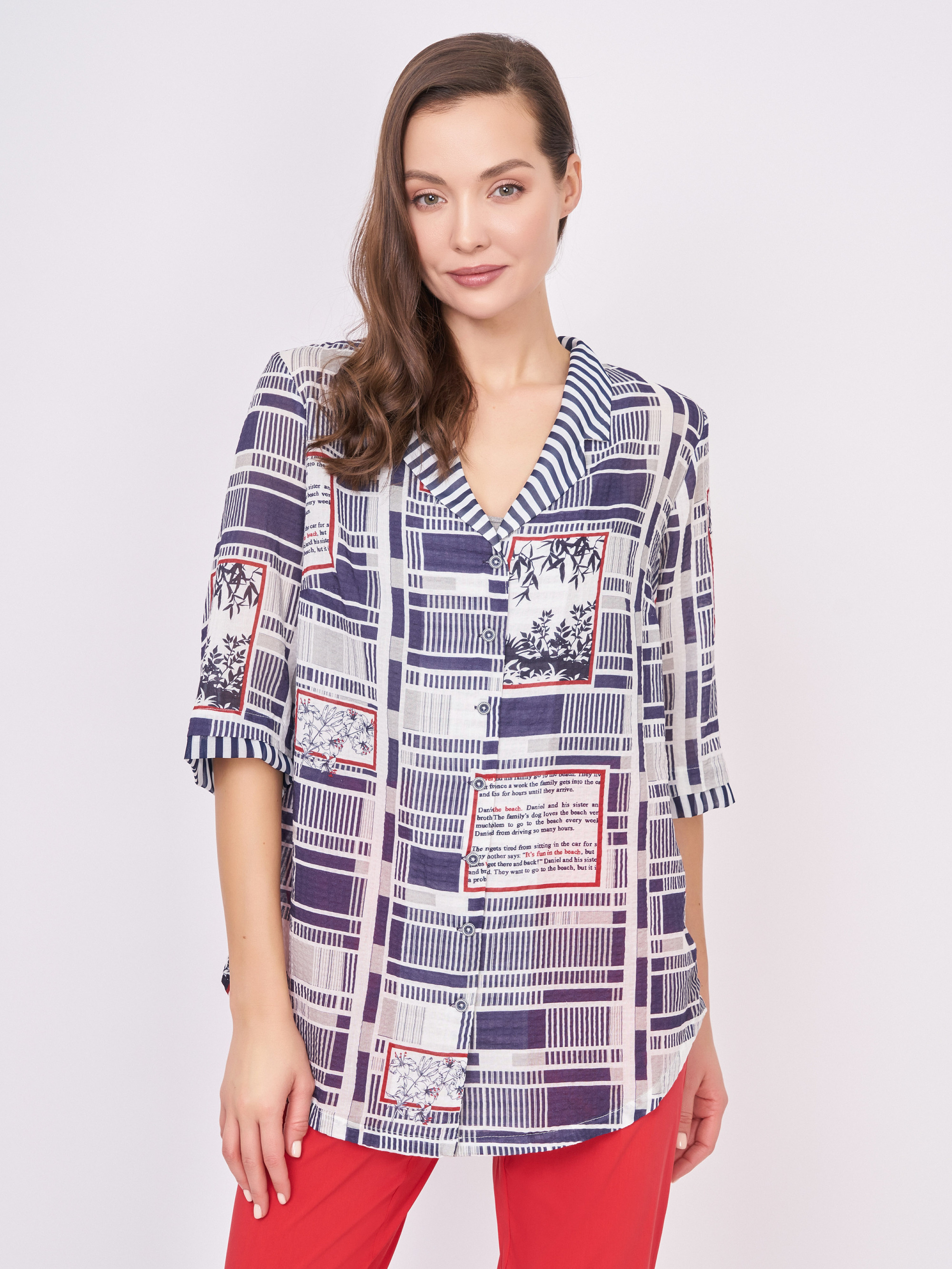 На сайте указаны российские размеры. Бело-синяя блузка трапеция на пуговицах, с отложным воротником, с красными вставками, с геометрическим, с цветочным рисунком и надписями. Длина по спинке: 72 см. Рост модели: 177 см.