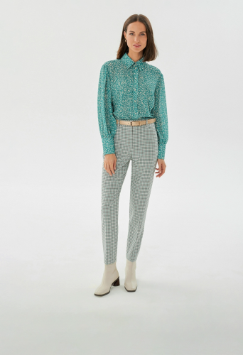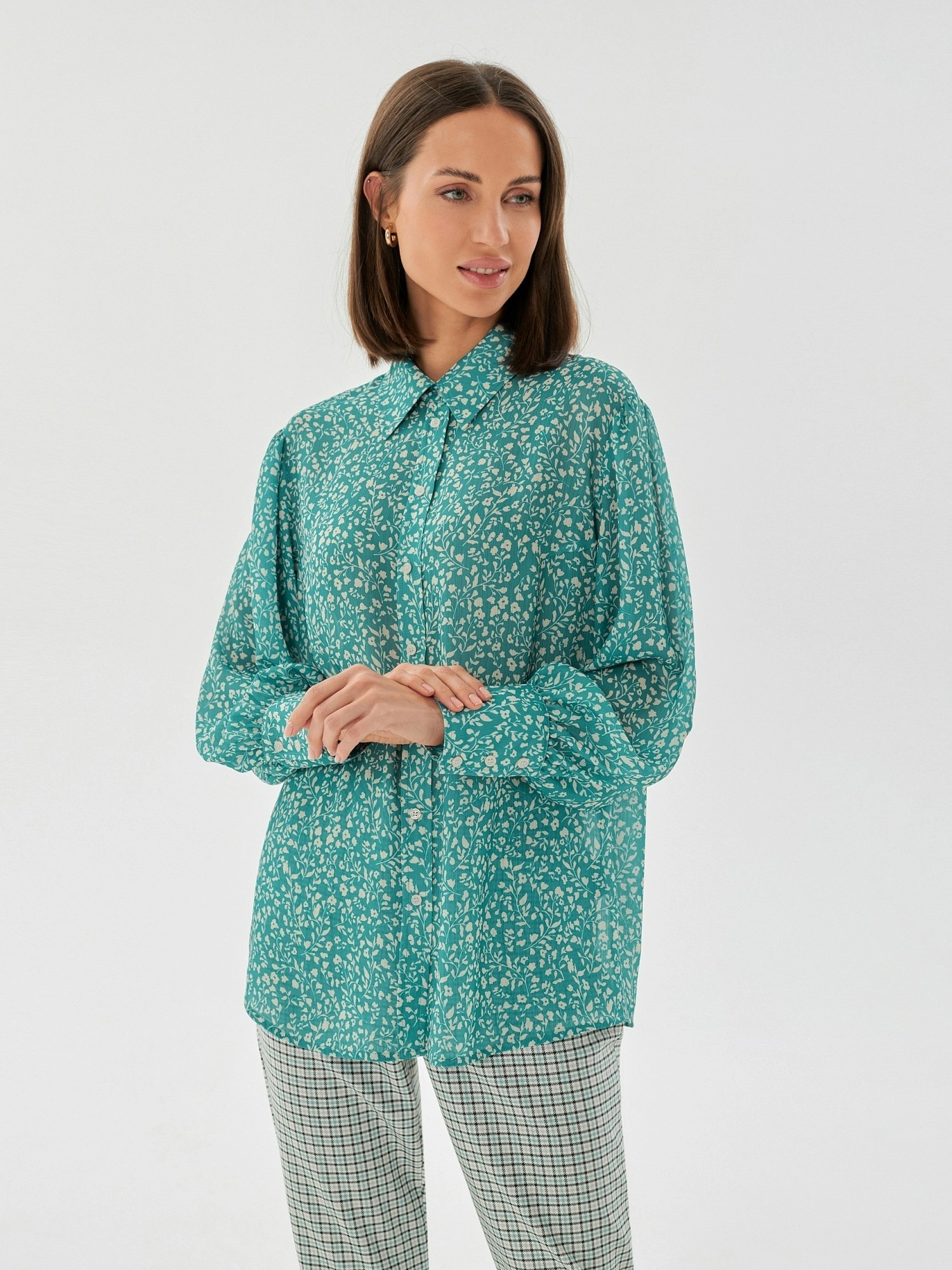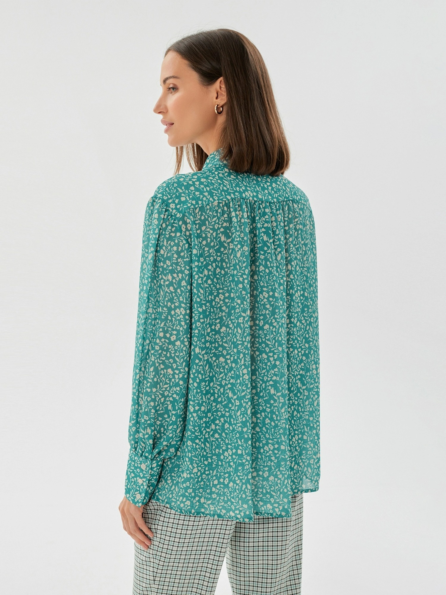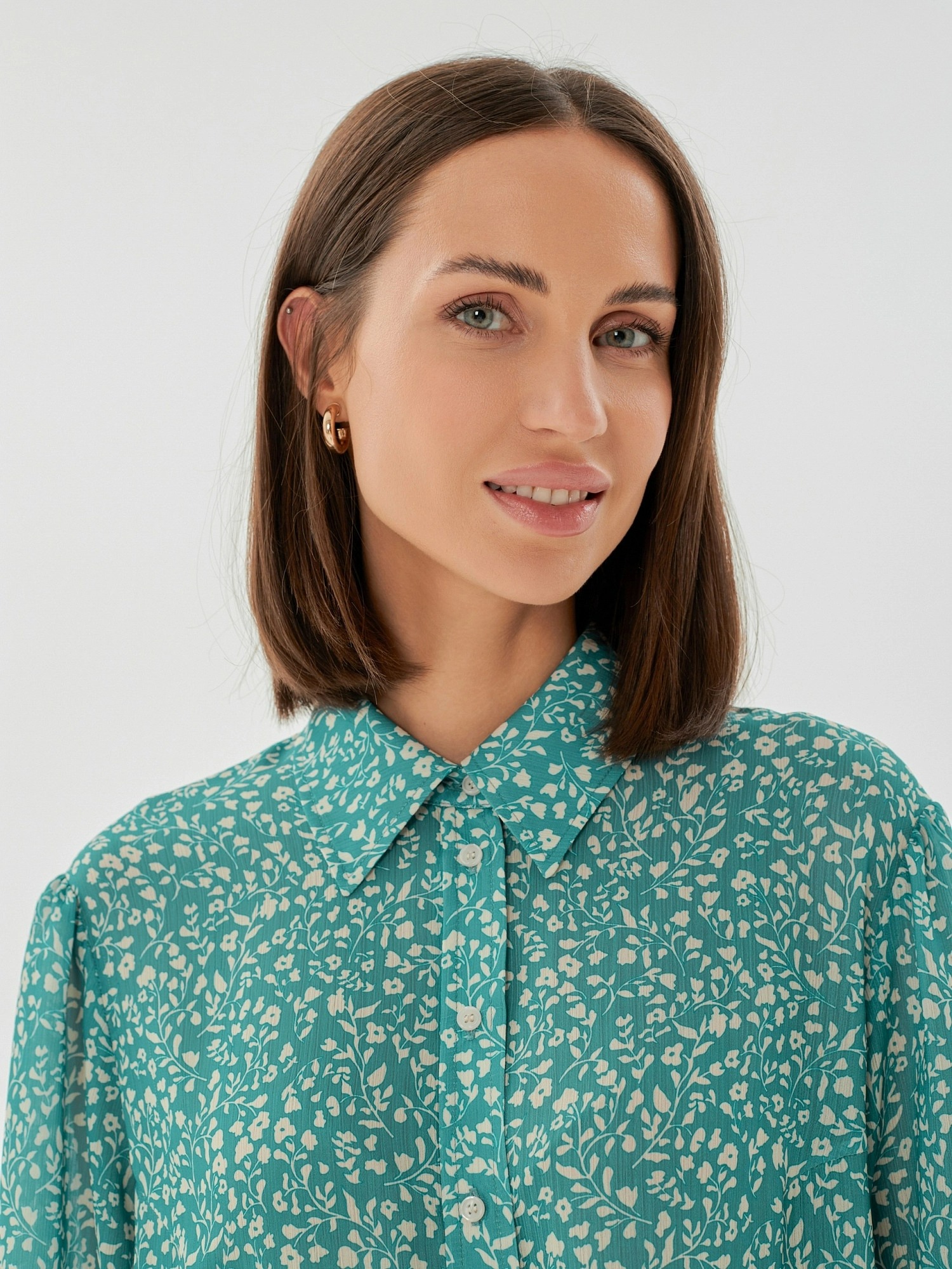 На сайте указаны российские размеры. Романтичная прямая блуза с отложным воротником бирюзового цвета с цветочным принтом из плательной ткани. Рост модели 175 см.