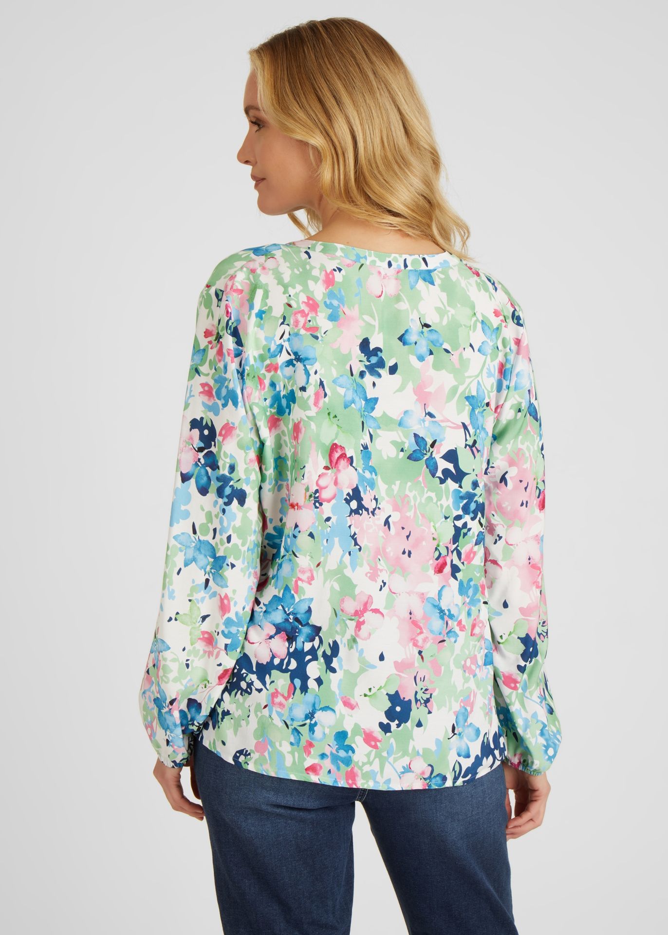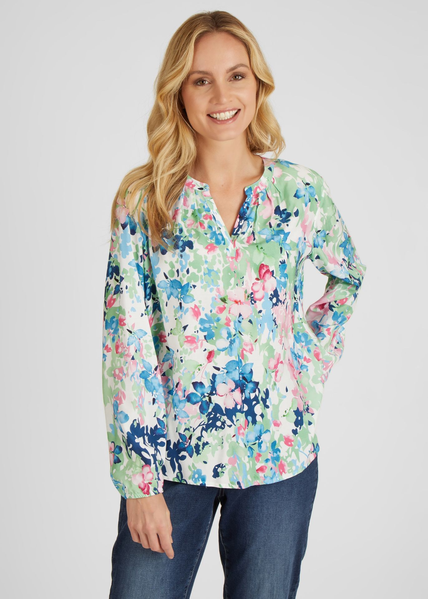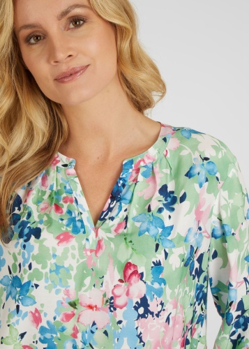 На сайте указаны российские размеры. Блузка впечатляет своим цветочным принтом по всей поверхности. Небольшой боковой разрез почти гарантирует идеальную посадку. Неброский воротник-стойка и V-образный вырез придают блузе дополнительную женственность. Сочетайте блузку с джинсами или небрежно с спортивными брюками. Рост модели 176 см. Длина по спинке от плеча для размера 46: 66 см.