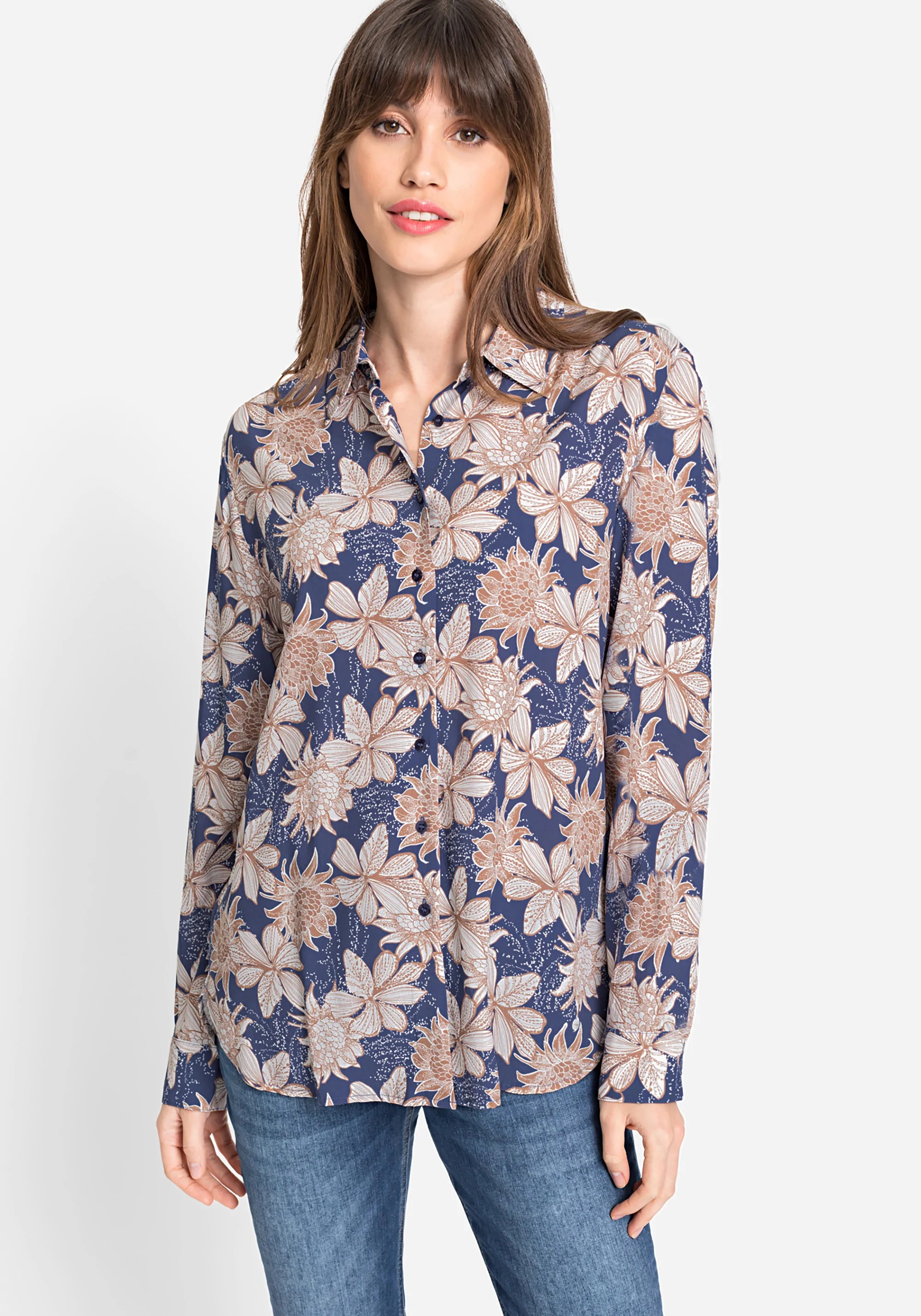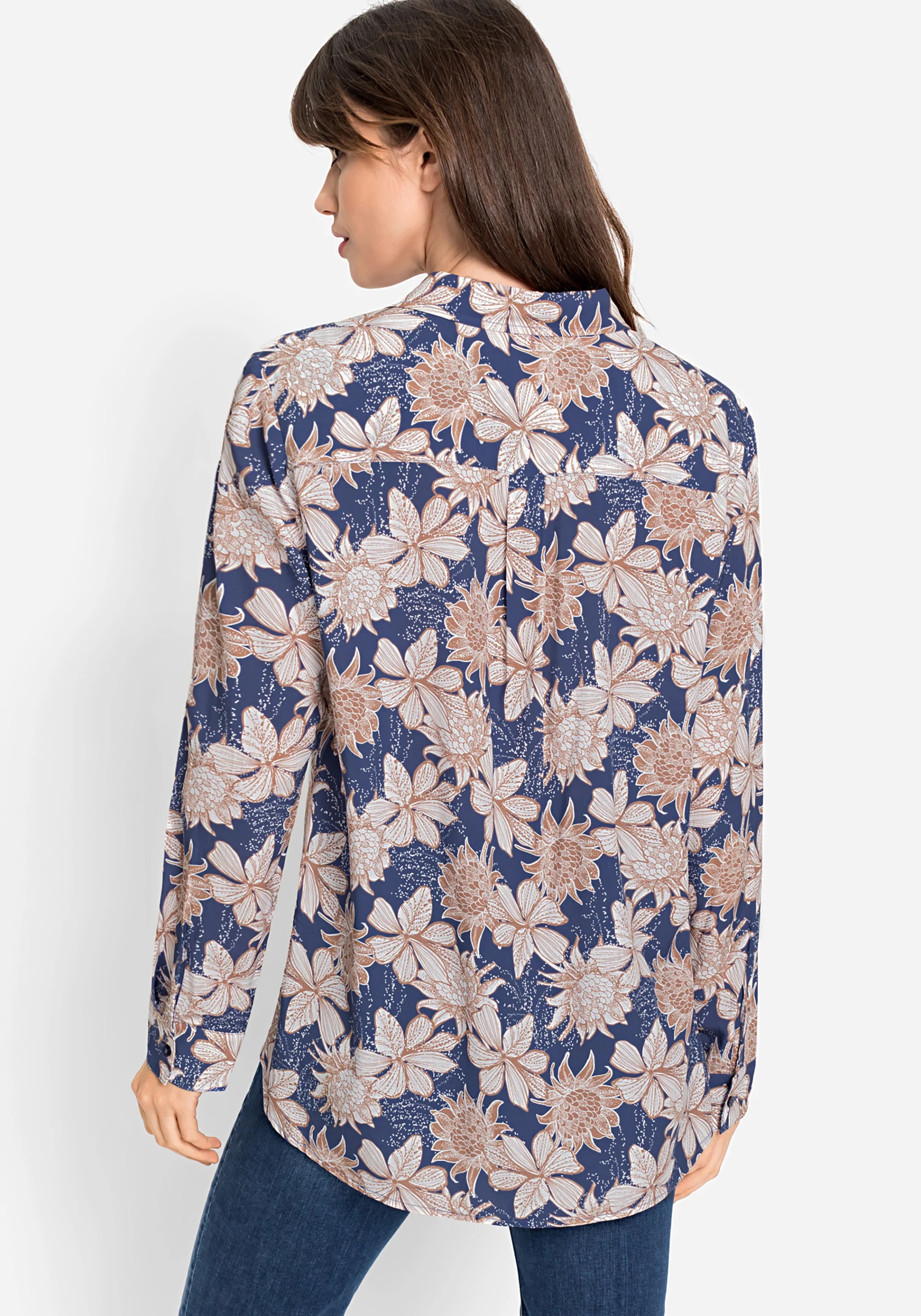 На сайте указаны Российские размеры. Блуза с женственным цветочным принтом передает классический силуэт и утонченный стиль с воротником, сплошной планкой на пуговицах и манжетами на пуговицах. Блузка сзади немного длиннее, чем спереди.