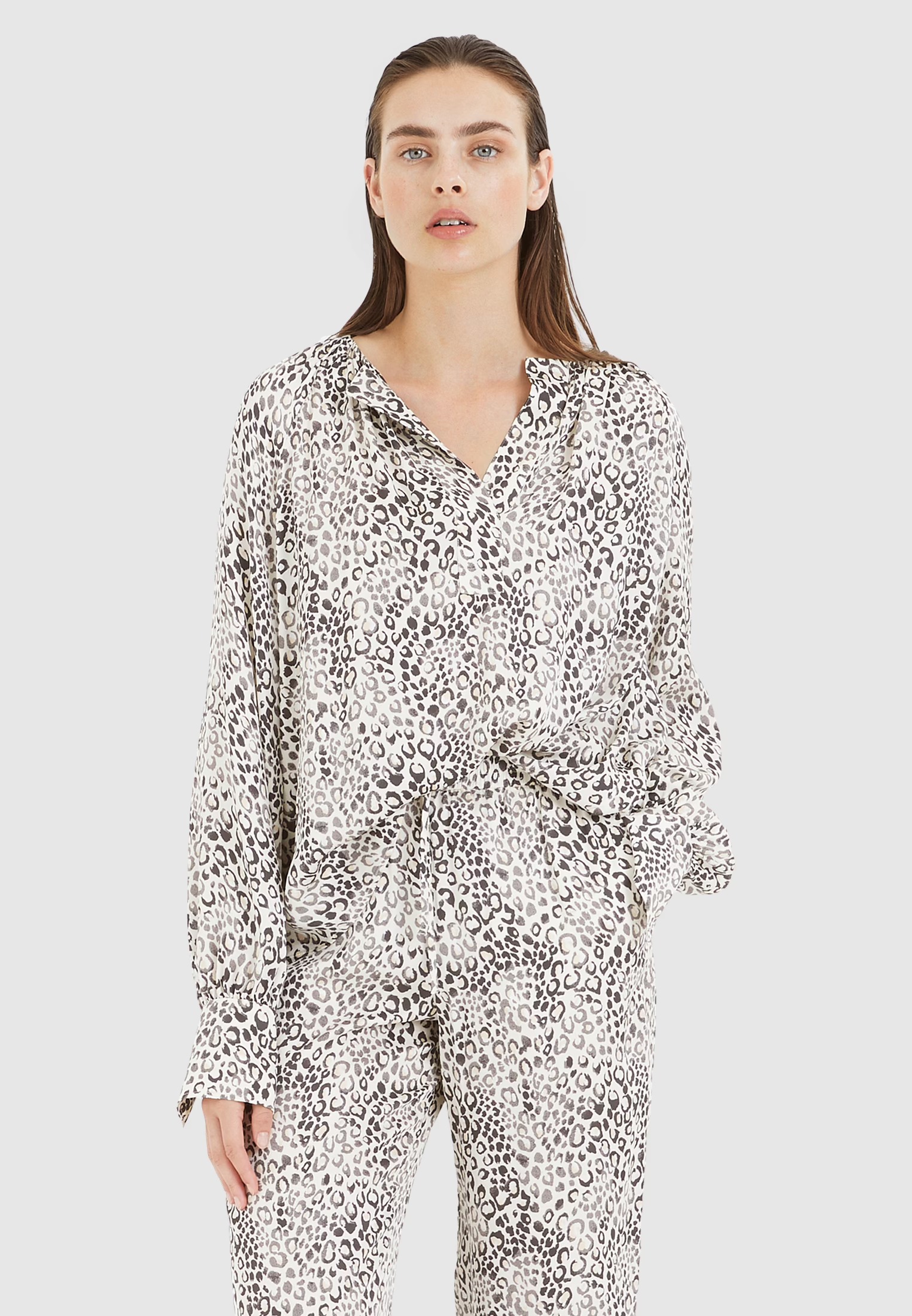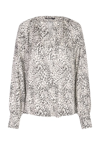 На сайте указаны российские размеры. Современный минималистичный леопардовый принт на этой свободной блузке привлекает внимание. Блузка с круглым вырезом имеет широкие манжеты, которые можно отвернуть, и рукава реглан. На вырезе горловины есть рюша.