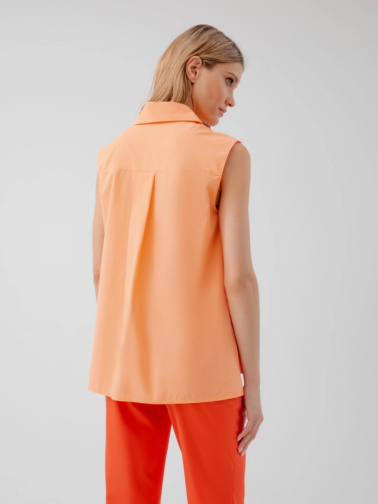 На сайте указаны российские размеры. Блуза прямого силуэта без рукавов и разрезами по бокам, имеет классический отложной воротник. Выполненная из 100% хлопка в персиковым цвете. Рост модели 175 см.